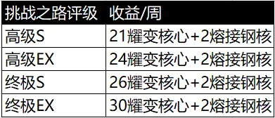 目前挑战之路是除兑换外比较稳定获取耀变核心的途径,鉴于挑战之路改版后的难度5有相当的难度,本指南中将同时提供挑战之路难度5的高级区以及终极区的S级、EX级奖励视为每周收益供参考并提供相应的兑换策略。