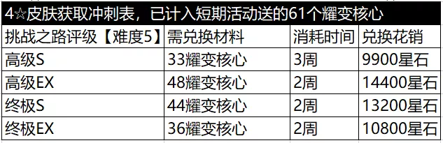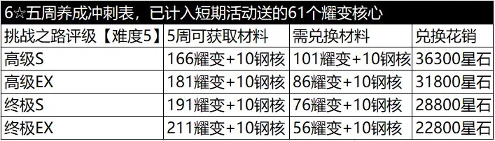 如不用星石兑换材料,处在挑战之路难度5的高级EX、终极S或终极EX挑战之路难度下4☆养成需要4周,处于高级S区则需要5周。