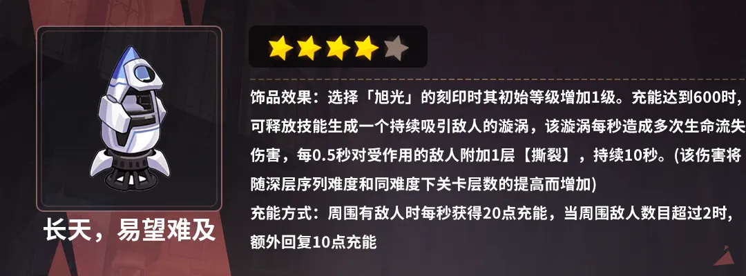 睡觉流可携带旭光四星追忆辅助聚怪,在怪多的情况下充能也稍快一些,可与云墨交替使用(即云墨聚第一波,旭光助战聚第二波),减少凹专烦恼。