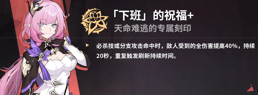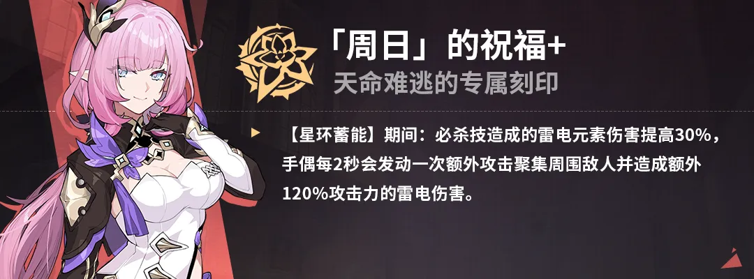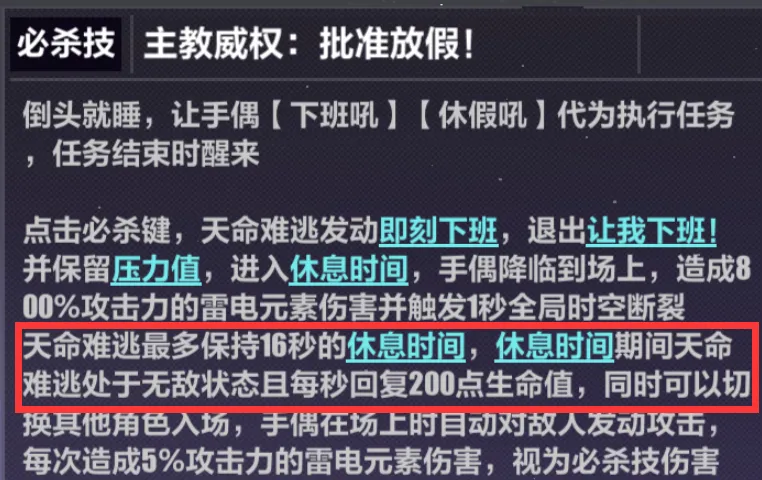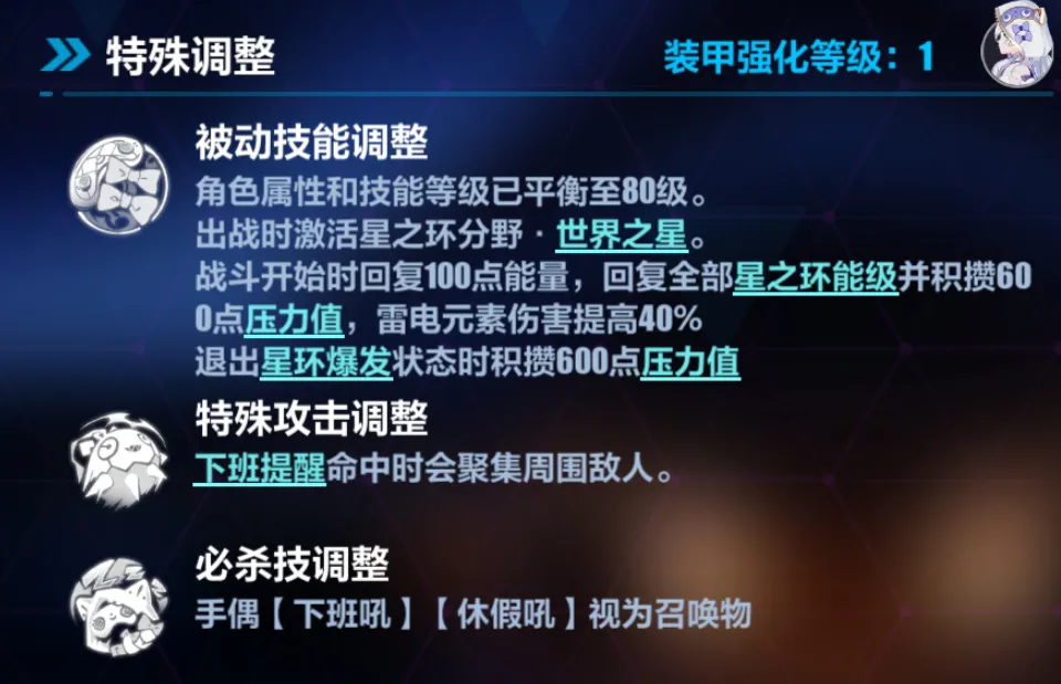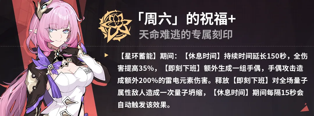 睡觉流的机制专属,简单来说就是睡觉时间延长至2分半,必杀技额外生成多一组手偶攻击,同时每15秒能对量子敌人进行一次量子坍缩。该专属是睡觉流的核心。