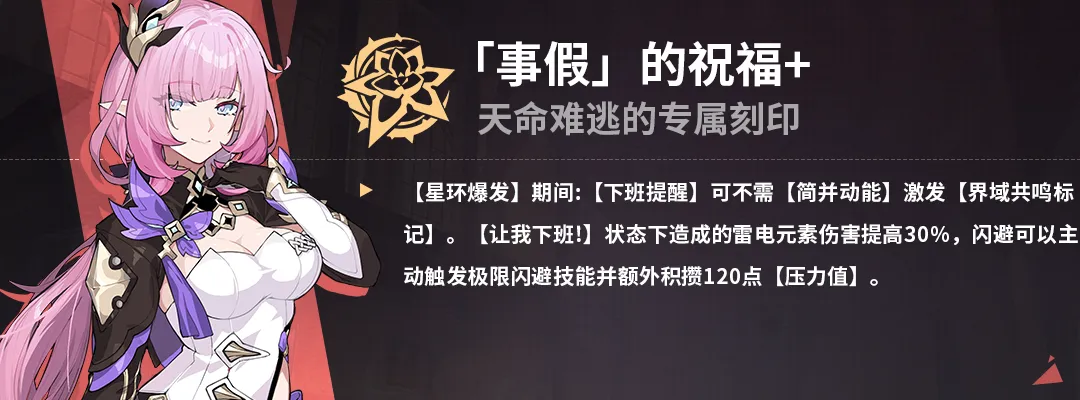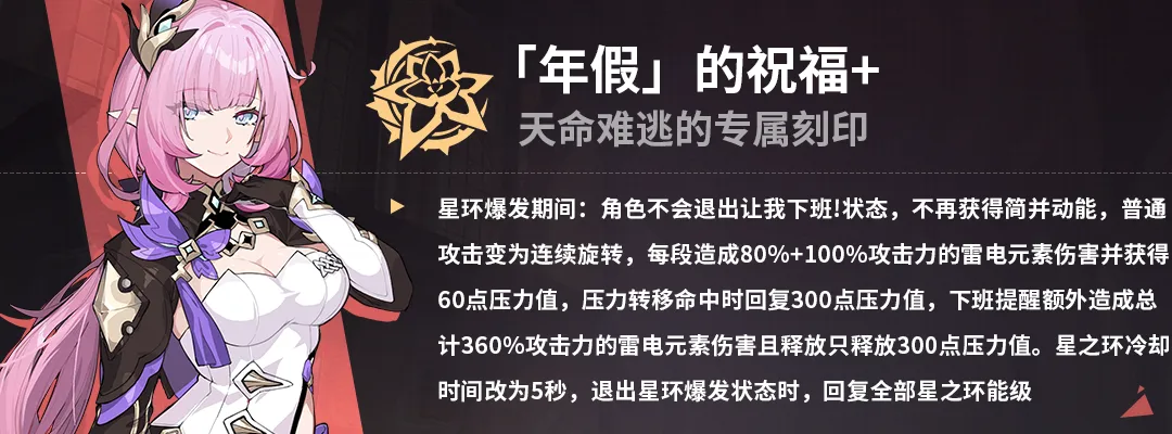 天命难逃是德丽莎的新装甲,在乐土内仍然分为星环流和非星环流(也称睡觉流),星环流需【年假】+【事假】双专起手,【下班】补强;而睡觉流则是【周六】起手,【周日】和【下班】进行补强。两个流派也比较简单,相较之下比较推荐安逸点的睡觉流。
