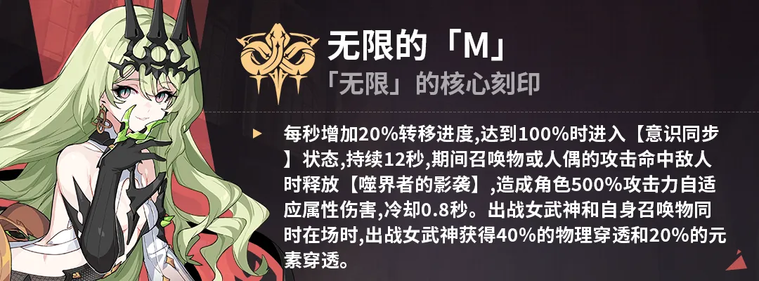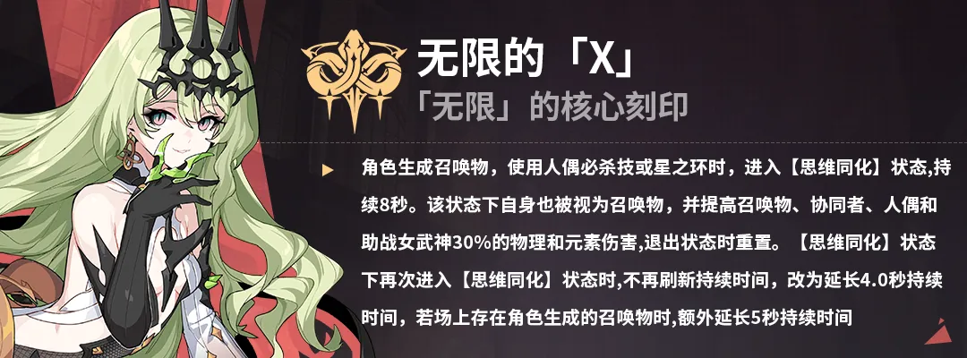 核心方面,由于睡觉流不会刷新召唤物,无法续无限Ⅰ的思维同化的持续时间,在打一些比较肉的怪的时候会导致后面加成丢失,所以直接拿无限Ⅱ就好。无限Ⅱ的增幅提供了【意识同步】状态的全覆盖、元素伤和易伤,不需要通过操作去启动,也比较适配睡觉流。