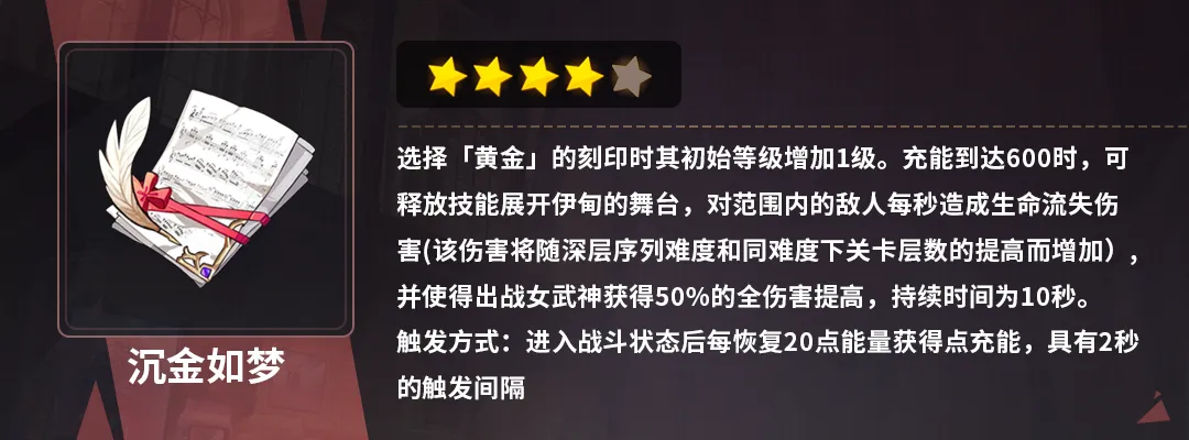 德丽莎带有麻痹特性,加上初始能量给的也多,也不怎么消耗能量,那么黄金自然是作为较好的开局刻印。开核后能获取到穿透、倍率,非常不错。