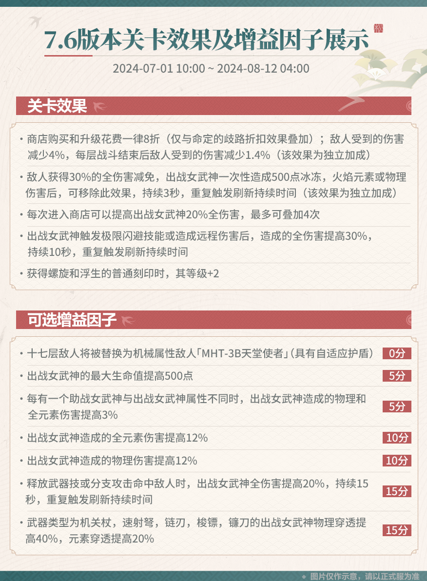 7.6版本更新后,来访者也将在「往世乐土」中迎接全新挑战,新的关卡效果及增益因子即将到来~