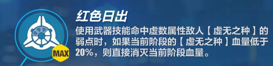 但是!这个爆炸伤害是视为弱点伤害的(敲黑板),配合渡鸦的【红色日出】技能,可以提高斩杀线,只要瞄准弱点的武器主动命中后,【虚无之种】的血量低于20%,就可以直接斩杀,配合延迟伤害(如炎律武器主动等)可以实现高血量斩杀,而其余弓箭武器则需要主动命中时【虚无之种】的血量本身就低于20%才能做到斩杀的效果。可以理解为渡鸦携带影夜栖羽命中弱点后,在触发爆燃的100%伤害之前,虚数怪血量降至20%以内均可实现斩杀;而其余弓箭只能在命中弱点前血量降至20%以内才能实现斩杀。高斩杀线在实际BOSS攻略中将有重要意义。