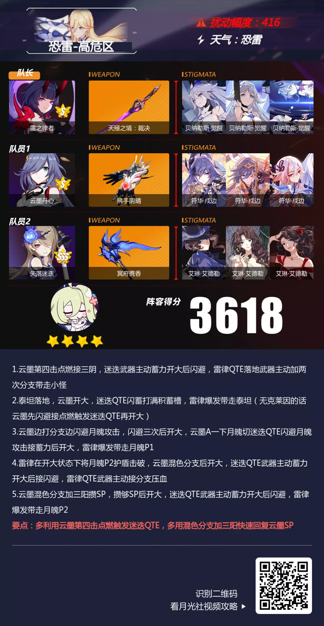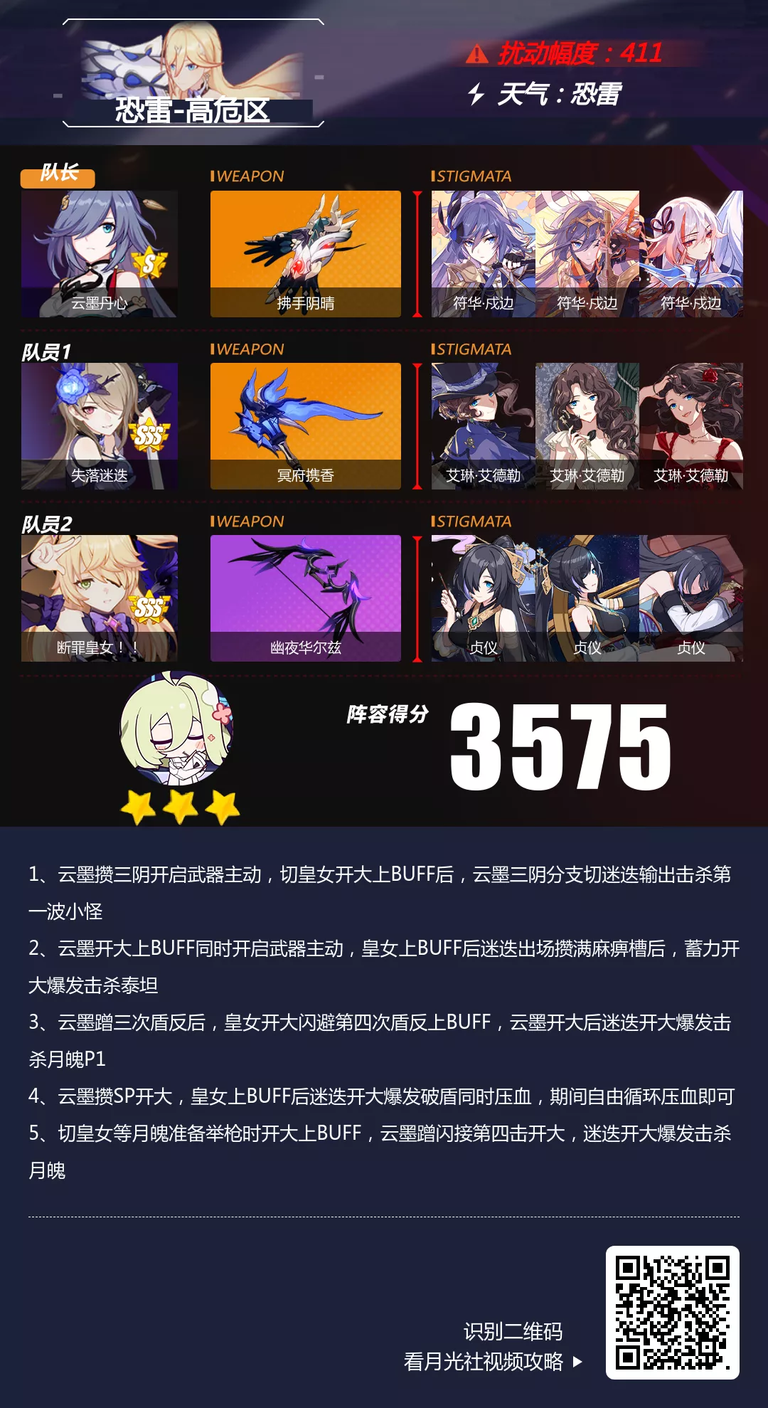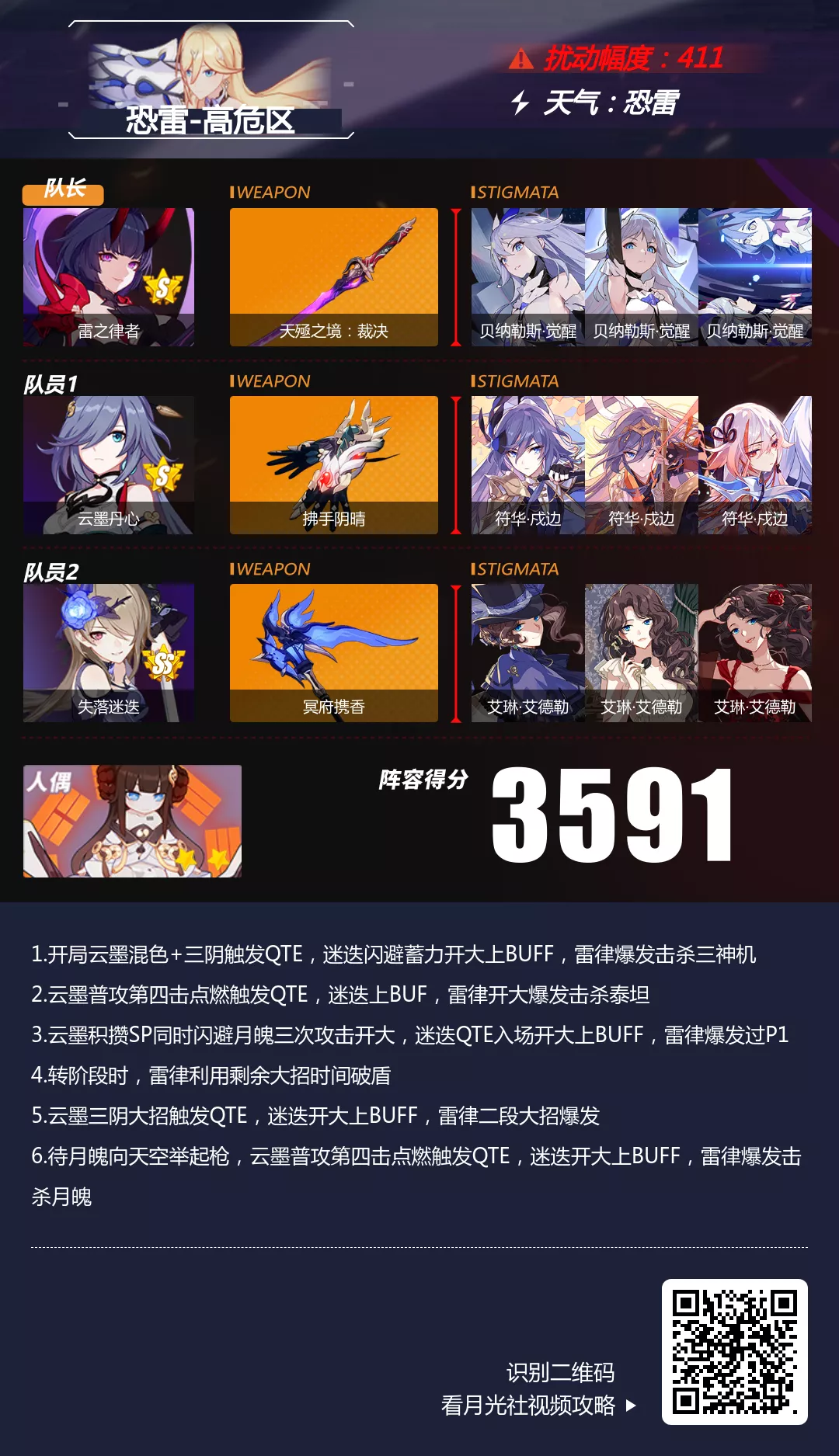 区域天气:恐雷区域效果:敌人受到的雷电元素伤害提高50%,受到的物理伤害降低50%高危区推荐主C:梅比乌斯,雷之律者,炎之律者 通关流程演示: