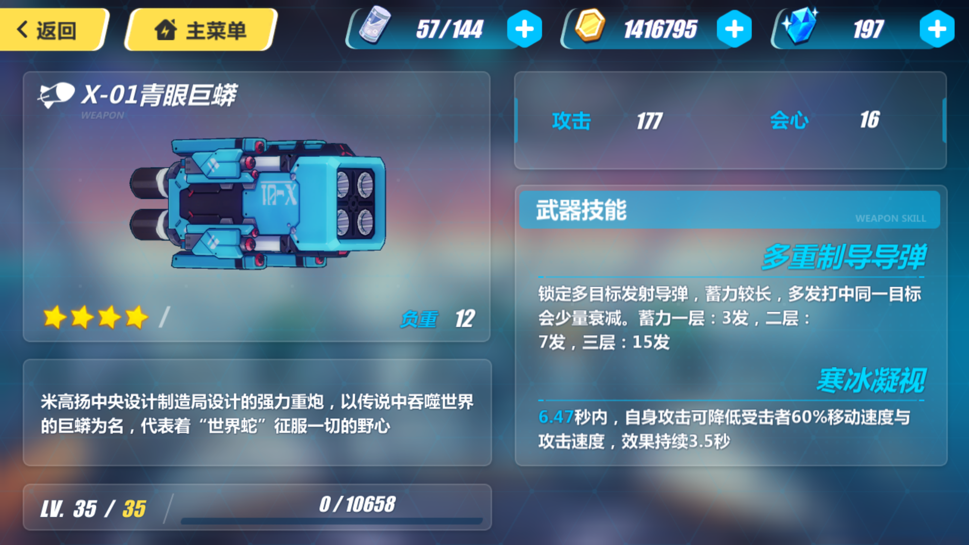 这是群里某大佬推荐的套路武器,首先面板看起来没什么出众的,但是技能,看到减速大家该想起来什么?对!青龙结界!这把武器跟07战车配鬼凯有异曲同工之妙。首先战车qte第二段伤害有个小延迟。而在这期间可以释放巨蟒的武器技能,这样打出来伤害就附加了减速效果。而群体浮空可以触发鬼凯的qte技能。一个触发了青龙结界的鬼凯qte是很可怕的。于是就出现了一个关于这把武器的套路:柯尔特圣女/晕炮山吹,青眼战车,qte圣痕鬼凯。 双重qte伤害清图效率极高!