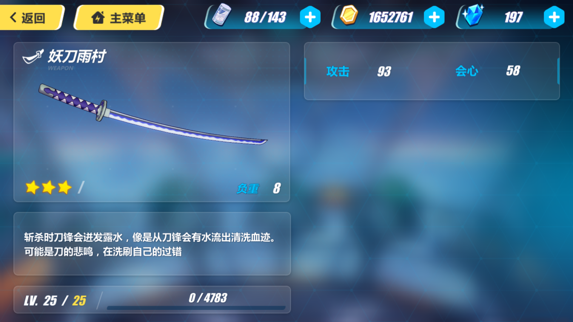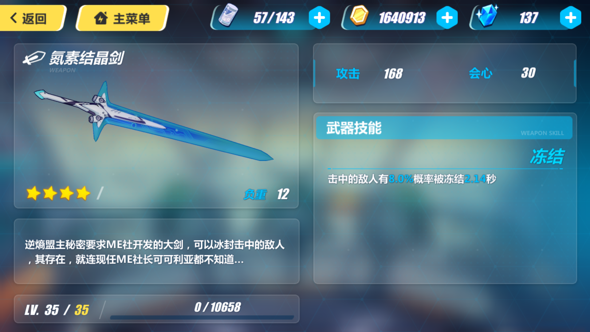 半透明宝石般的剑刃,高达30的会心。这把武器还是可以一看的,被动冻结,击中有8%的概率冻结敌人,可惜姬子本身攻速不快。相对的凯旋跟深红攻速能稍快一些,加上s凯旋可以对冻结目标增伤所以有练凯旋的朋友不妨升级一把结晶剑。