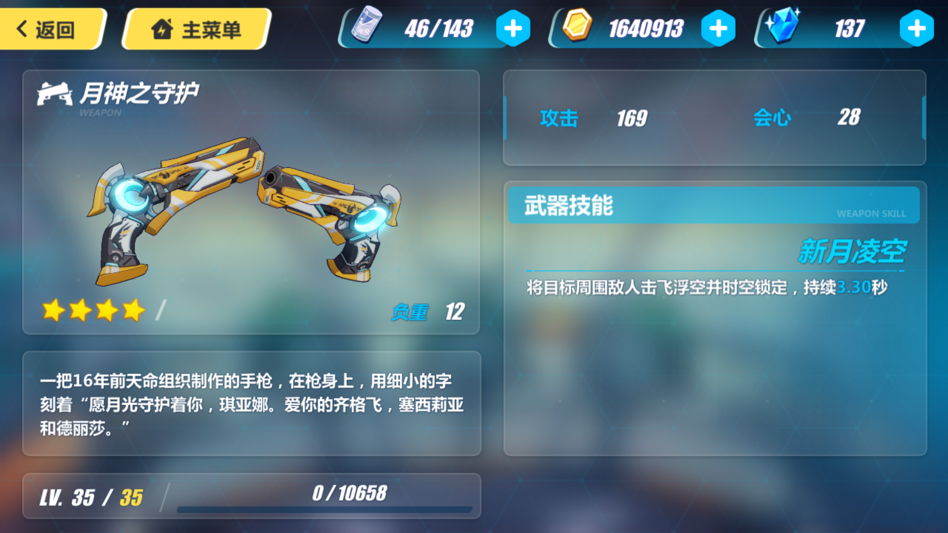 氪金就送的武器。满级可以单体控制3秒多,并且提供了浮空和时空锁定的双重控制效果。前期打boss神器。面板一般,类似的还有水妖精二型,但是水妖精的冻结效果局限太大,所以如果前期什么装备都没有,升一把月神枪用用是不错的选择。而且个人觉得这把枪挺帅的。