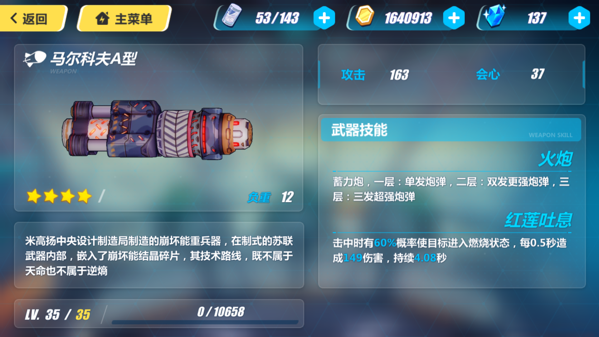 熟悉的163+37的面板,然而这把武器实用的原因不仅仅是面板,看被动红莲吐息:击中时有概率进入燃烧状态,每半秒附加伤害。这个伤害看起来不高,实际上很疼的。而且战车的技能可以对炮弹加成也可以对燃烧目标加成。这就让带了马a的战车在QTE之后不至于站着发呆,就算打一炮就跑也可以保持不错的输出。而且山吹的大招过载模式也可以触发马a的燃烧效果。可以说这跟苗刀电魂一样是一把万金油的武器。