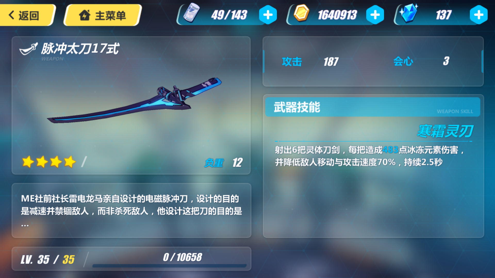 很容易抽出来的武器,过了天父困难ex也能送一把(大佬补充)。。。面板的话攻击不错但是会心太低了。很多人觉得啊呀武器技能挺炫酷的用出来也就这么回事。其实不然,这把刀可以说是鬼凯专用的四星武器了,首先鬼凯的被动:青龙结界,对冰冻减速的敌人全伤害加深。 说实话刚开始拿到鬼凯的时候我觉得设计鬼凯的人脑子有病,一个全雷元素伤害的角色你弄个冰冻被动算怎么回事?后来慢慢的我觉得这个被动,强!注意,被动对减速的敌人就可以触发,而脉冲太刀17式的攻击就会使敌人减速,那么就会触发青龙结界,而且这把武器的主动技能减速效果不止2.5秒。因为是六把剑,一把一把延迟发射。而且可以在任何动作包括大招的时候发射。所以这把武器可以长时间触发鬼凯的伤害加成,使鬼凯伤害最大化。