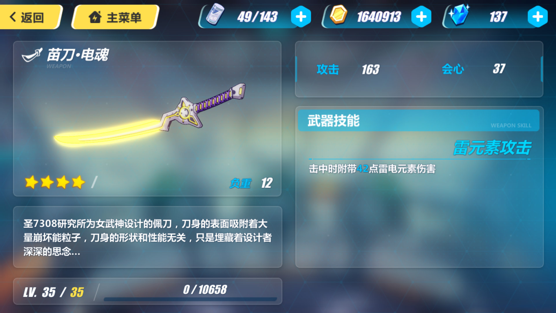 任务即送的武器,初始三星,升满4星。先说面板,163的攻击37的会心。跟水妖精一模一样,不错的面板配合凶残的武器被动使得这把刀在四星武器里实用度极高。击中时附带42雷元素伤害。也就是说只要砍中就会附加这些伤害而且元素增伤的武器被动使得这把刀百搭,可以配合鬼凯让她的雷元素伤害更进一步,可以配合强袭使她打出成吨的附加伤害。甚至因为不错的面板暴击可以在实在没别的武器可用的时候给鹦鹉冲击加点暴击。总的来说百搭!强力!实用!还容易获得!