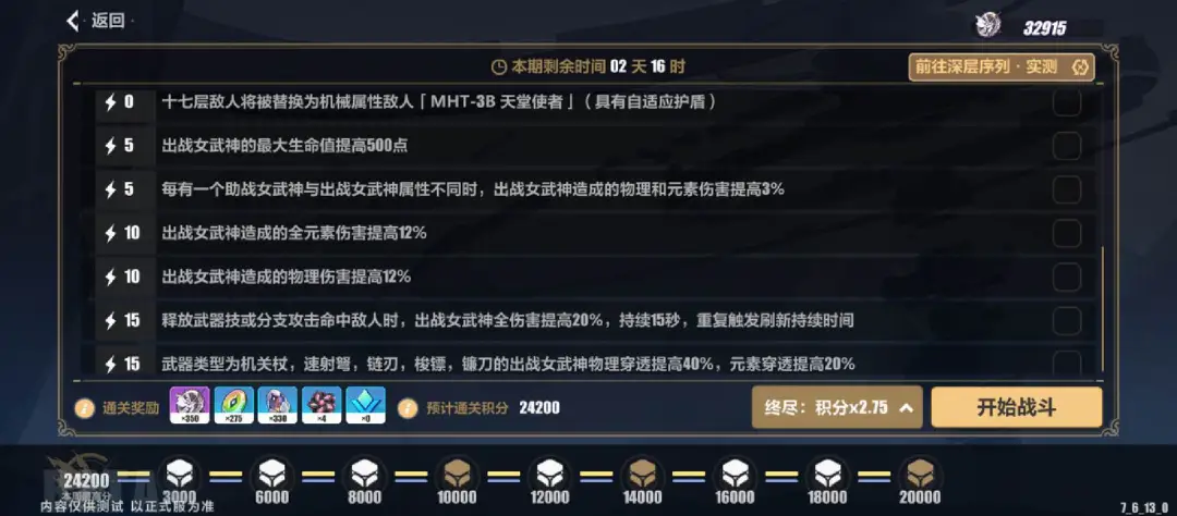 穿透增益方面,对比起正式服来说双枪、驱动核心和火箭锤下岗,换上了镰刀、梭镖以及新武器机关仗。其他的增益比较一般,关底的天堂使者也是正式服的老熟人了,护盾更改成自适应护盾,不过实测起来感觉这个盾不是特别好破,看看后续怎么调整吧。