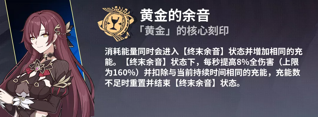 黄金【余音】适合在拿到【雨四光】后获取,可用于补充输出。大招耗能100SP,核心技能可维持14秒,只需将原本20秒的流程压进14秒即可让第二轮大招吃到高额加成。