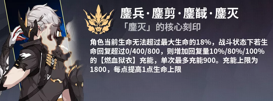 乐土中,天元每次触发闪避都能回复25%最大生命值,相当契合鏖灭的【鏖兵】核心。它能使角色血量锁至18%以下,而角色的回复能提升其充能,进而提升血量上限,拉高普通鏖灭刻印的加成。至此,我们还可以回过头来看【疾驰】的SP回复能力:一次闪避+冲刺可回18点,三闪54点。只需再获取鏖灭回能,即可支撑大招100点的消耗。