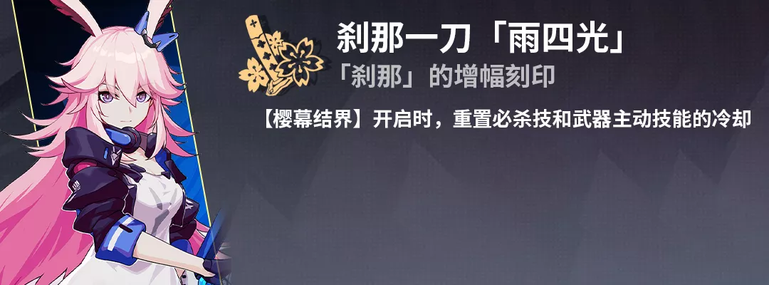 刹那的闪避易伤数值不错可以先选,后续可选偏功能性的普通刻印。其中闪避次数+1是必备刻印,而闪避回能可用于维持大招释放。增幅刻印上,【雨四光】在三闪后能重置大招CD,可用于压缩流程,将20秒一次的“三闪一大”压至12秒一次:每次闪避只冲一次,加快大招释放频率。