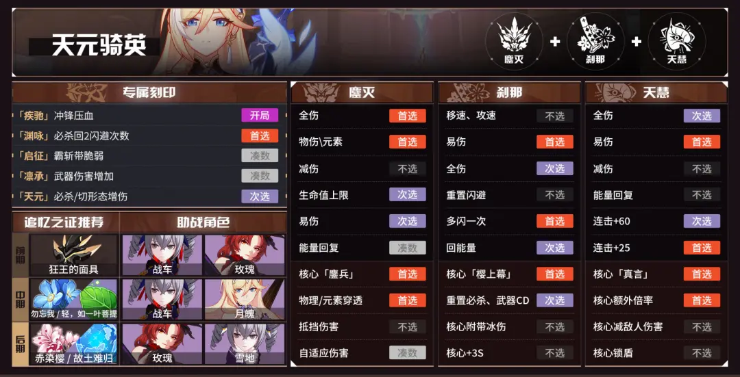 徽章方面,前期携带【狂王的面具】使鏖灭尽快成型,中期则可更换【勿忘我】或【轻,如一叶菩提】以保证刹那或连击的成型。最后,若前面刻印选择不理想,还可以使用【故土难归】查漏补缺;亦或是携带【赤染樱】,增加每轮樱上幕结算的伤害。