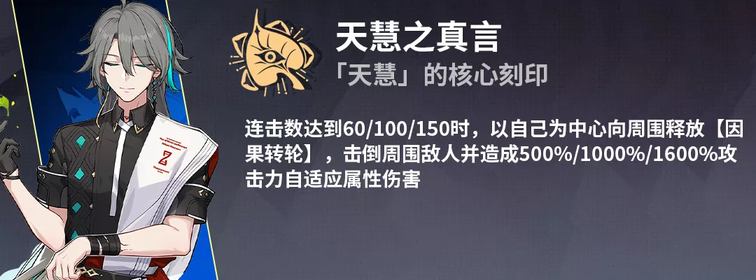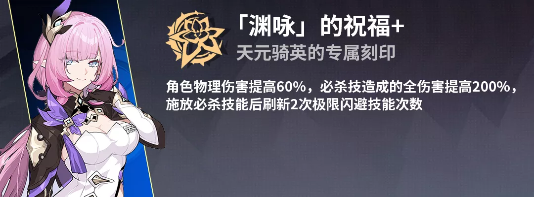 成型刻印,同样有三层作用。角色加成不必多说,而必杀刷新闪避则为“开创流”的循环核心:天元大招CD正好能吃满六次冲锋,需完成三次闪避。【渊咏】能刷新两次闪避,所以只需拿到闪避次数+1的刻印,配合CD期间自身回复的一次闪避,即可达成“三闪一大”循环。