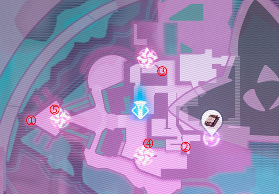共4个,均分布在居民区(上方区域)。前3个属于比较简单的解密,第4个的位置就比较奇葩了,需要从一侧打开激光机关、并从另一侧开眼镜跳跃平台开启。