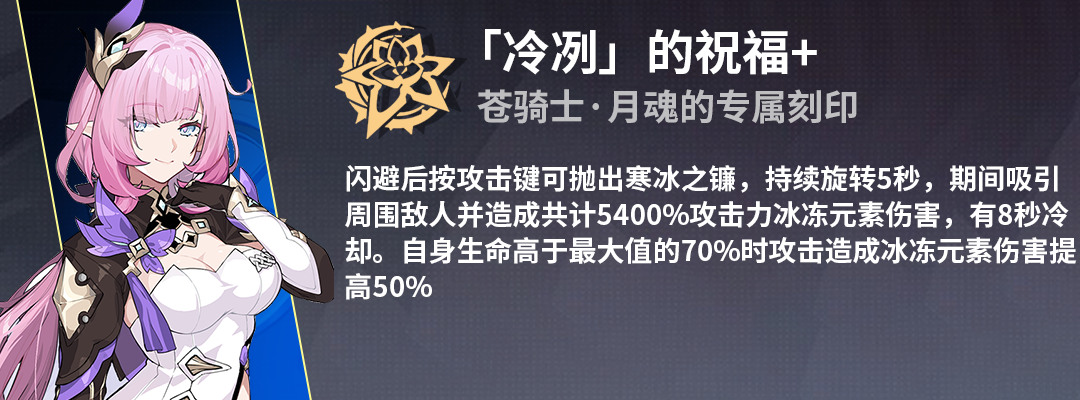 月魂本身三分之二血量以上有加成,冷冽的50%冰伤又要求血量在70%以上,【玫瑰】是绝对选不了的,不小心带了也绝对别用。