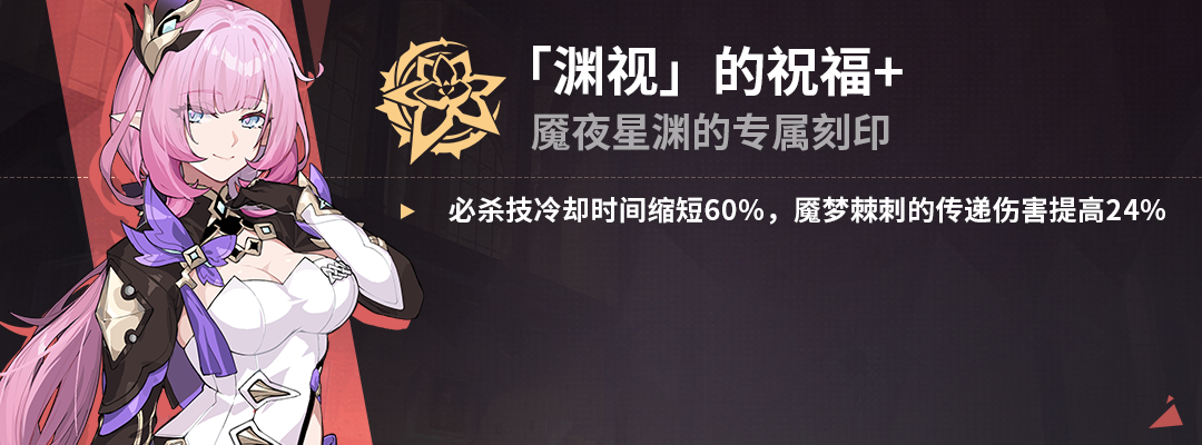 此时可先拿持续8秒的刹那,平稳过渡,或者干脆转型浮生Ⅱ。此思路旨在最大化一波必杀的伤害:使用增伤更强的【浴毒】专属与骇兔助战,配合加成常驻的浮生Ⅱ,一波更比六波强。没有必杀减CD,冰希的SP压力也不大。此路线开局轻松,可携爱莉四星追忆,在七层补【渊视】与【破茧】(回SP)专属,后续正常循环。