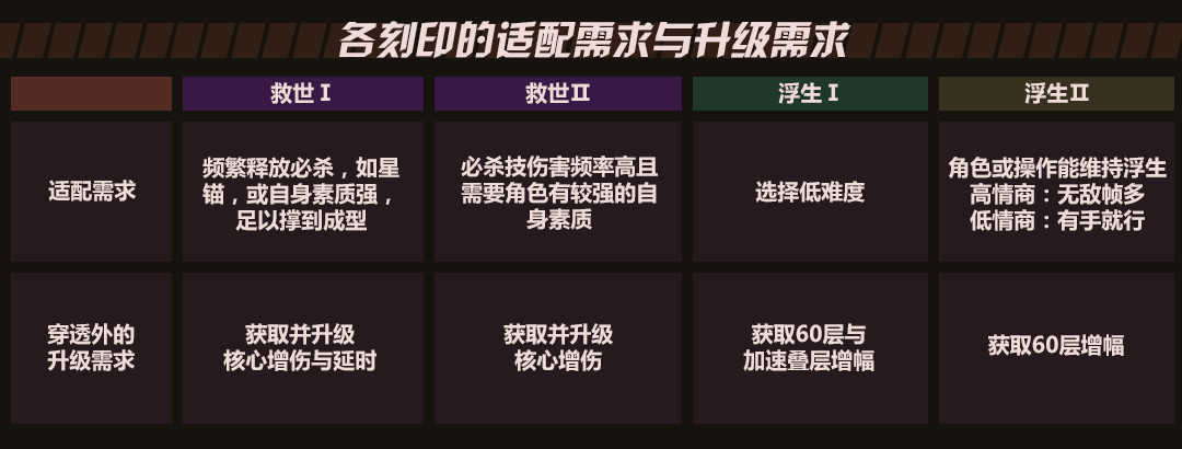 以三专挑战第四层的阿波尼亚,凭借强力的专属刻印素质,浮生还是救世的区别不大。以六层结束后四普通+一核心的情况考虑第七层,浮生Ⅱ的领先优势明显。一来常驻加成就要比救世Ⅱ更高,二来无需浪费一轮循环来启动。