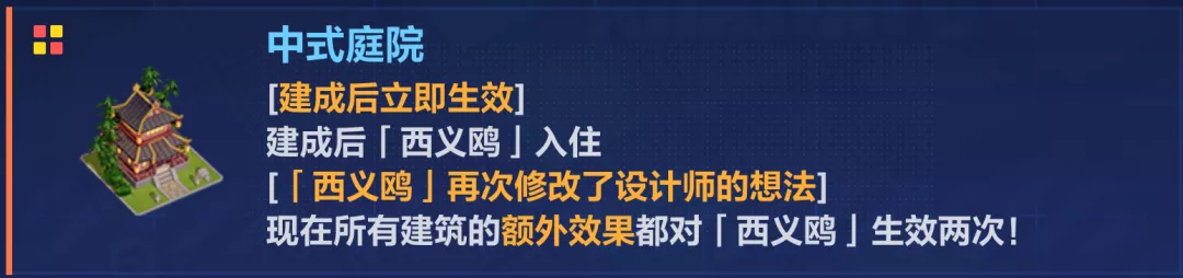 按照惯例红方块先建好宿舍和中式庭院增加人口,之后的红方块优先建舞台和游戏厅;蓝色方块这局只需建舞台;白色方块全部建游戏厅;黄色方块先建好中式庭院和补给站后开始建游戏厅。