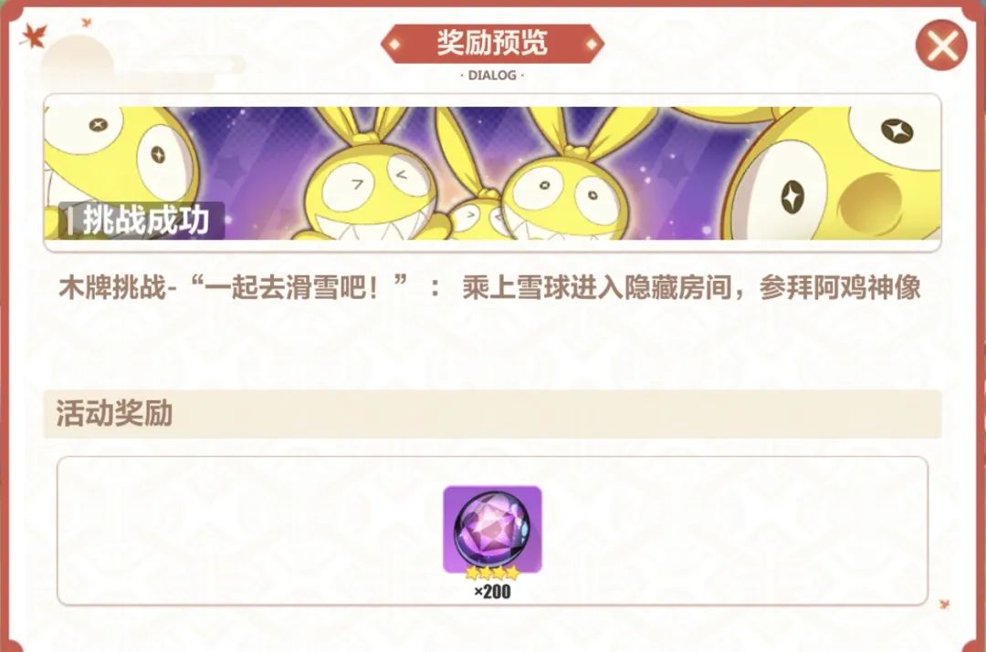 这一关先绕开两个雪球,往后不用躲,乘着道中一颗大雪球进入隐藏的房间(雪球击飞距离有偏差,进不去可以多试几次),与阿鸡神像互动即可完成挑战。