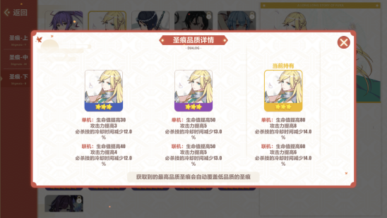 通关任意关卡都可以获得圣痕的抽取机会,获得重复圣痕且品质相同的情况时,圣痕会自动转化成七彩卵石。值得一提的是圣痕是有三等品质分级的,最等级的圣痕与最低等的圣痕属性差距较大。单机和联动的加成也不尽相同,舰长在装备时可以多留意一下。