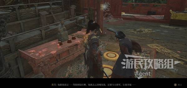 老婆婆面前是个蜀王金像,在蜀王金像使用蜀神赐物,能消除心魔。旁边有个明军告示。