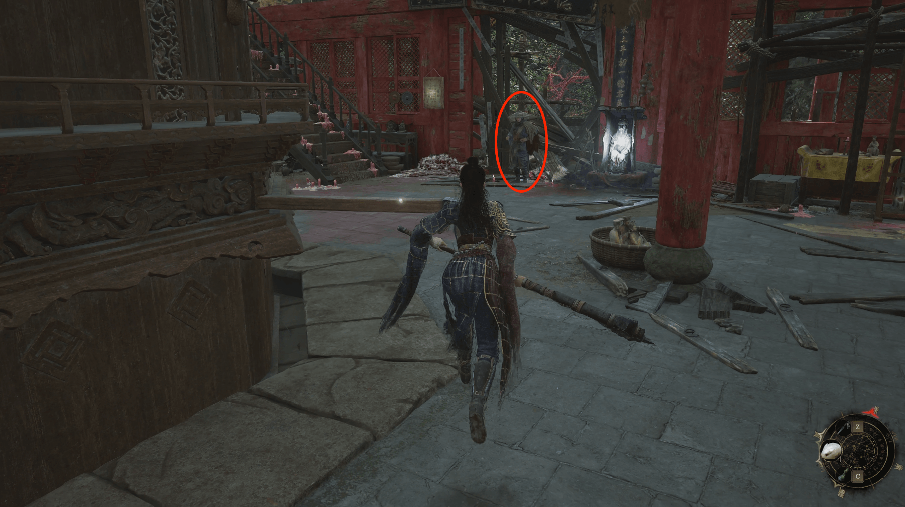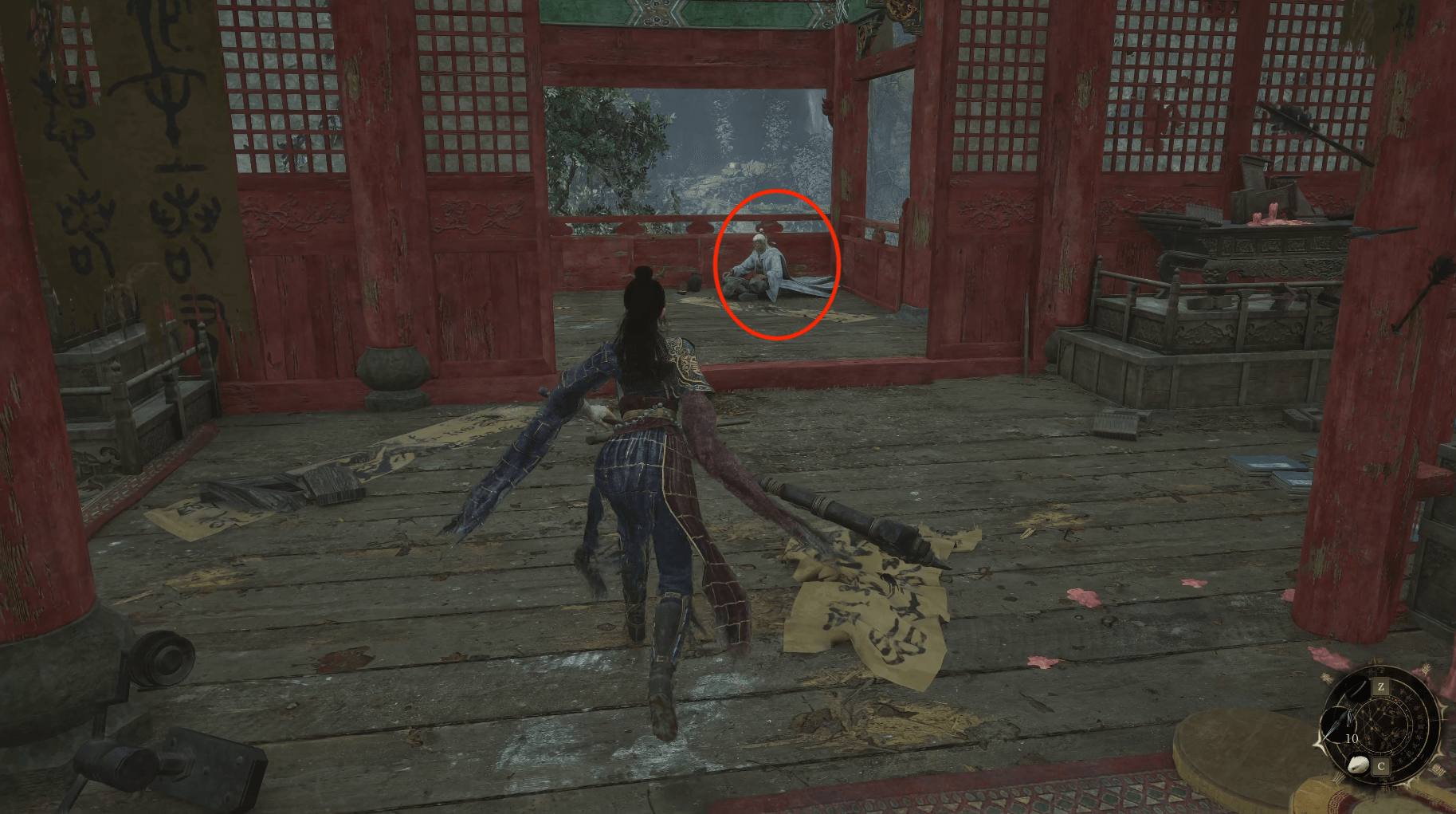 在神龛旁,你会再次遇到之前在含心禅院扶起的吴刚。与他对话并交付【金钵盂】后,可以消耗赤汞购买消耗道具、先神之言和装备,吴刚卖的装备是通过击杀小怪概率掉落的套装。紧接着沿着神龛旁边的楼梯上到二楼,正前面能看到位老婆婆谯英,远远就听到她说保佑我儿谯麟平平安安,谯麟就是当时在普元寺二楼躺在席子上病的很重的NPC,从婆婆的对话中可以得知他是被罗家大院的陆红柳所伤,将谯麟的【桃木刚卯】交付即可获得【蜀神赐物*1】,在上3楼的楼梯旁有【紫山茶*3】