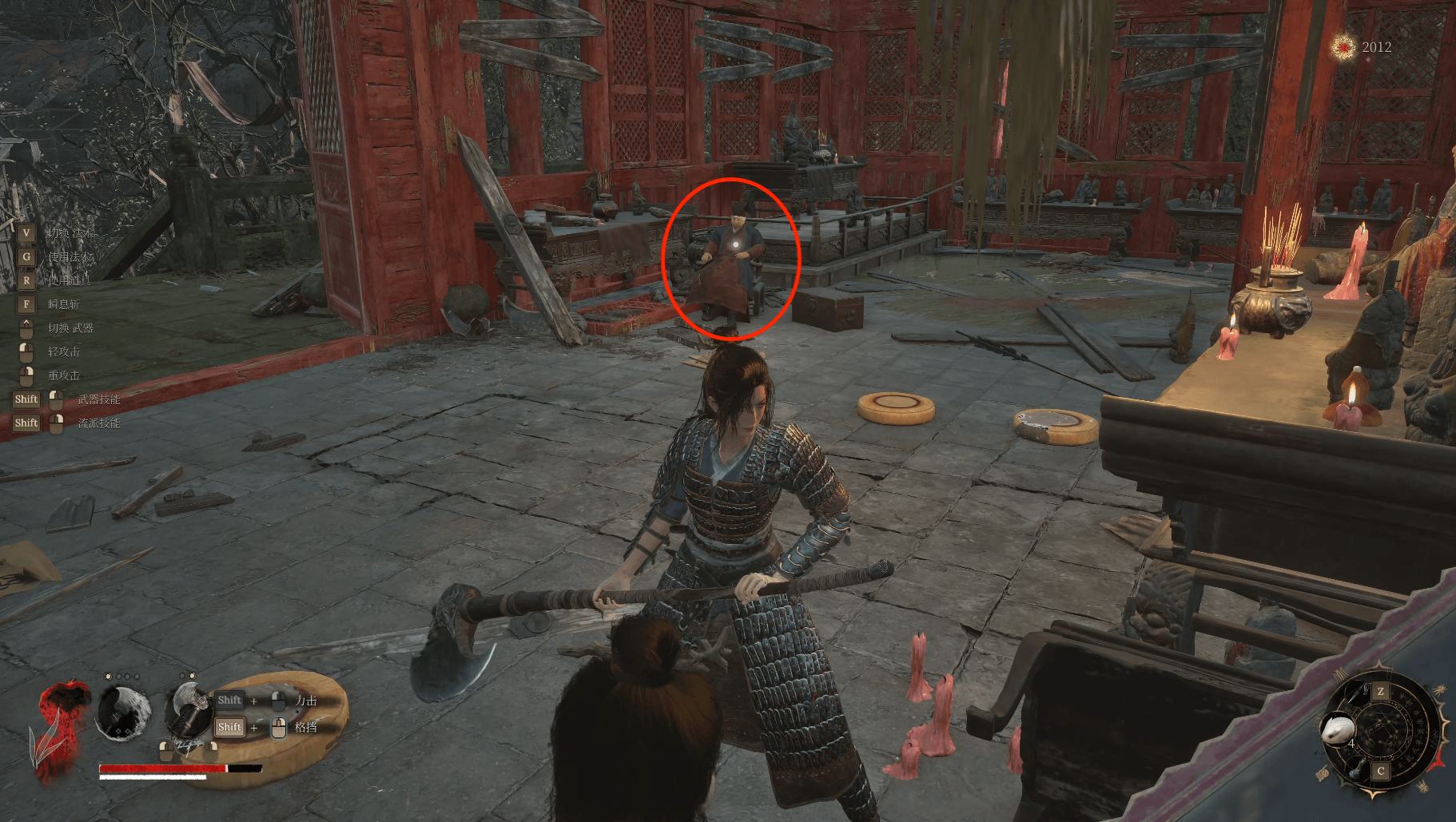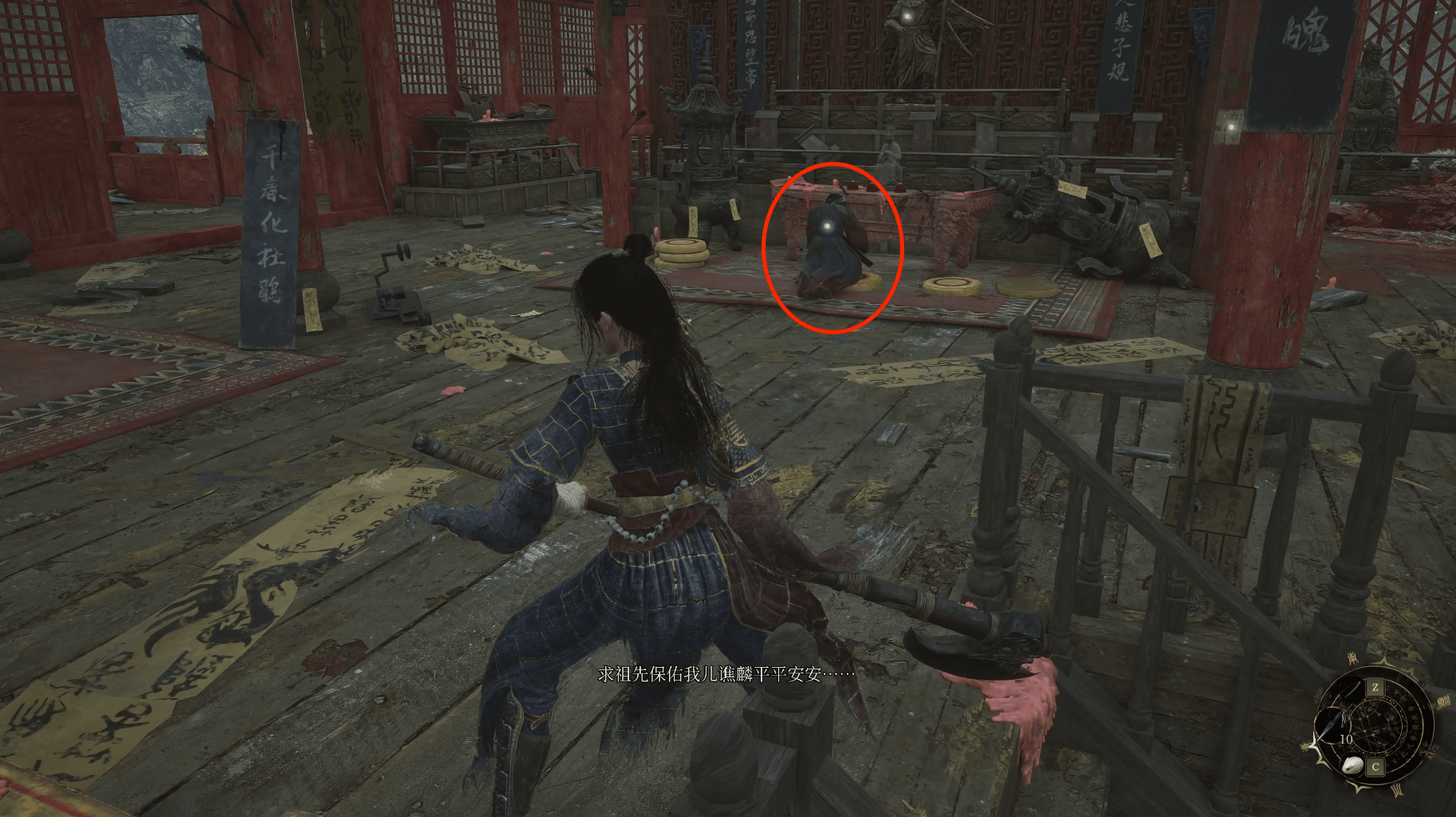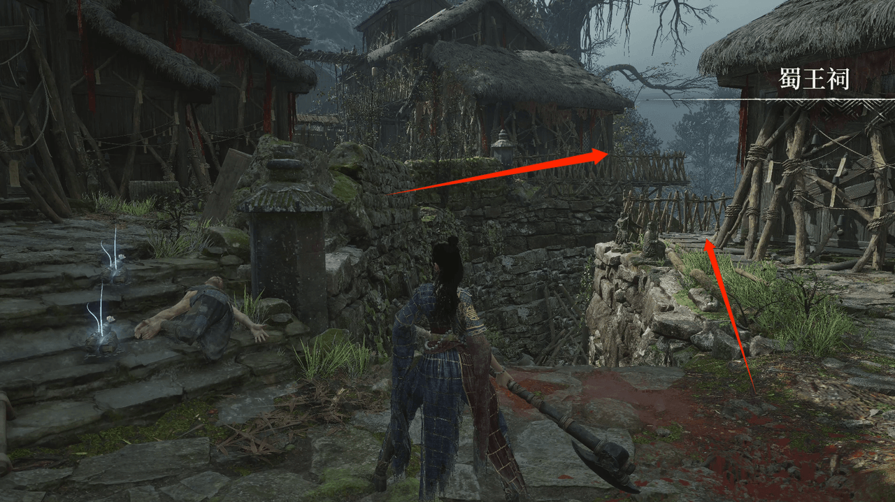 栅栏碎裂处沿着屋檐跳下可以来到蜀王祠正门两侧,两边可以分别拾取【萌发的赤汞*1】【紫山茶*3】。然后就准备回到三楼去打我们的第二个boss禄秉璋,门口会捡到染血手书,战斗中吹响【骨哨】可以召唤年岁长助战。
