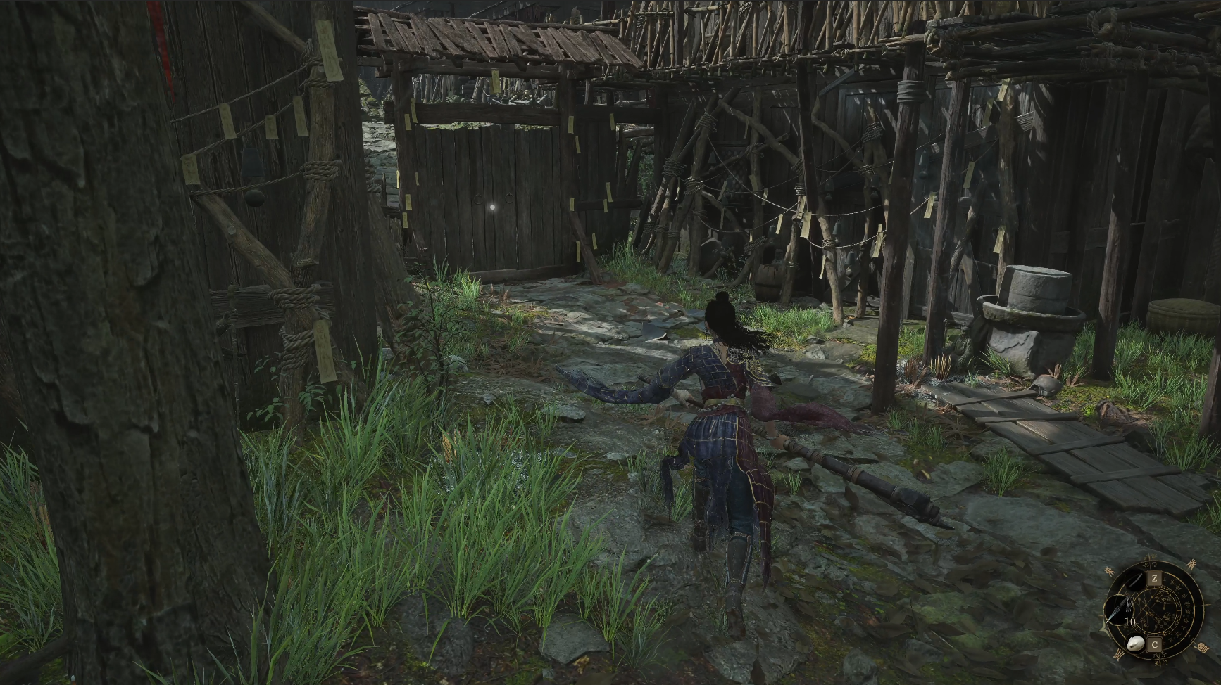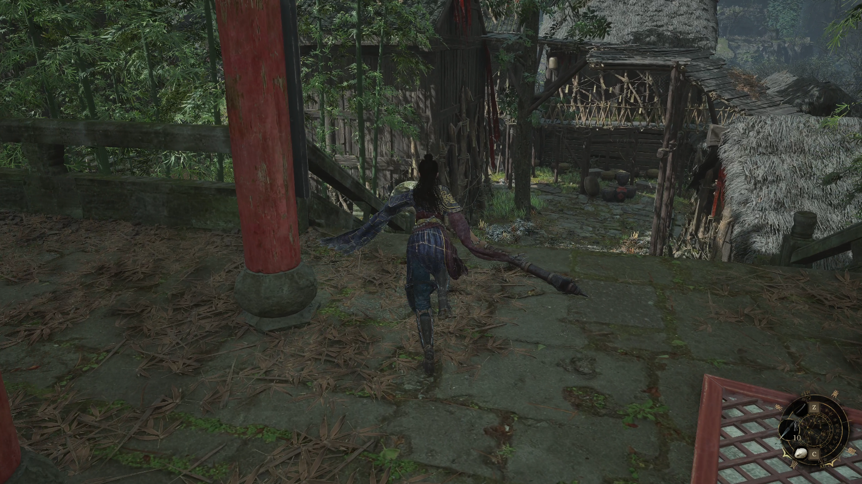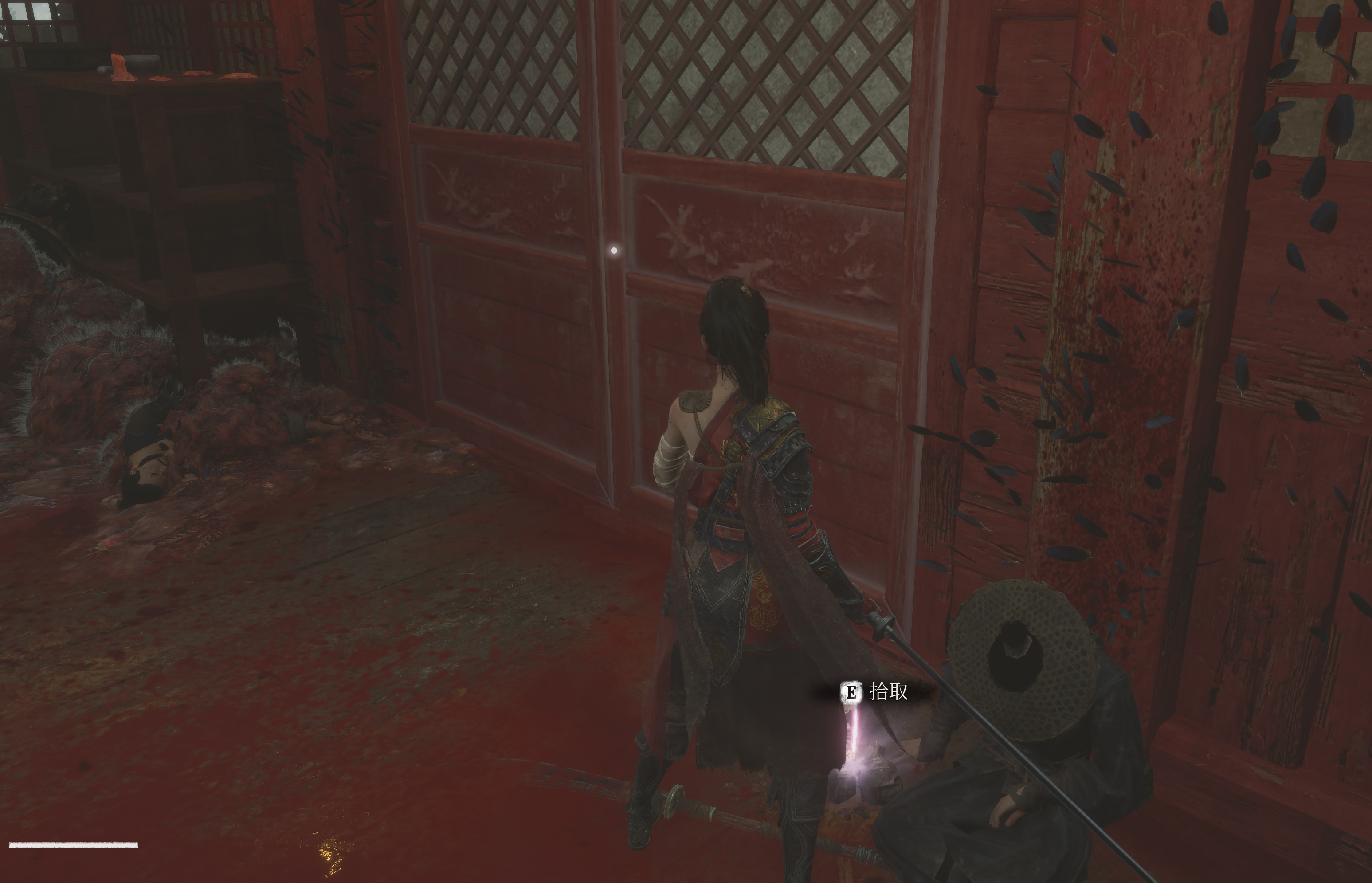 栅栏碎裂处沿着屋檐跳下可以来到蜀王祠正门两侧,两边可以分别拾取【萌发的赤汞*1】【紫山茶*3】。然后就准备回到三楼去打我们的第二个boss禄秉璋,门口会捡到染血手书,战斗中吹响【骨哨】可以召唤年岁长助战。