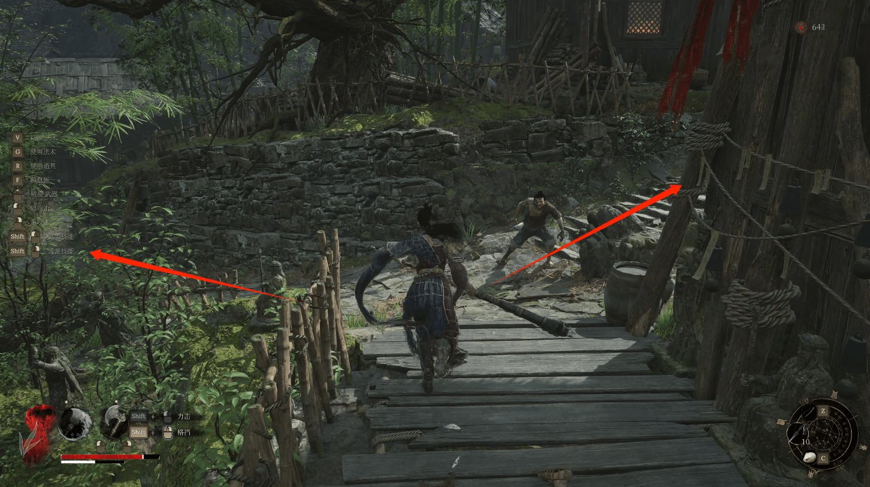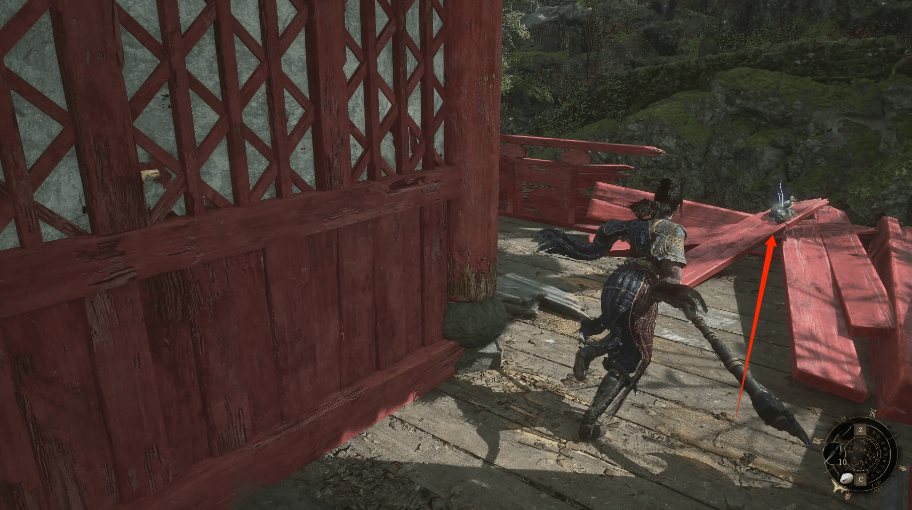 左侧箭头末端有个坛子怪,击败掉落【黯淡红羽】,沿着刚刚的箭头走到最下方后前方下台阶是死路,台阶往下一点点拾取【萌发的赤汞*1】,身后窗前拾取【灯笼果*1】,我们走右侧箭头处木平台边缘拾取【飞刀*3】。