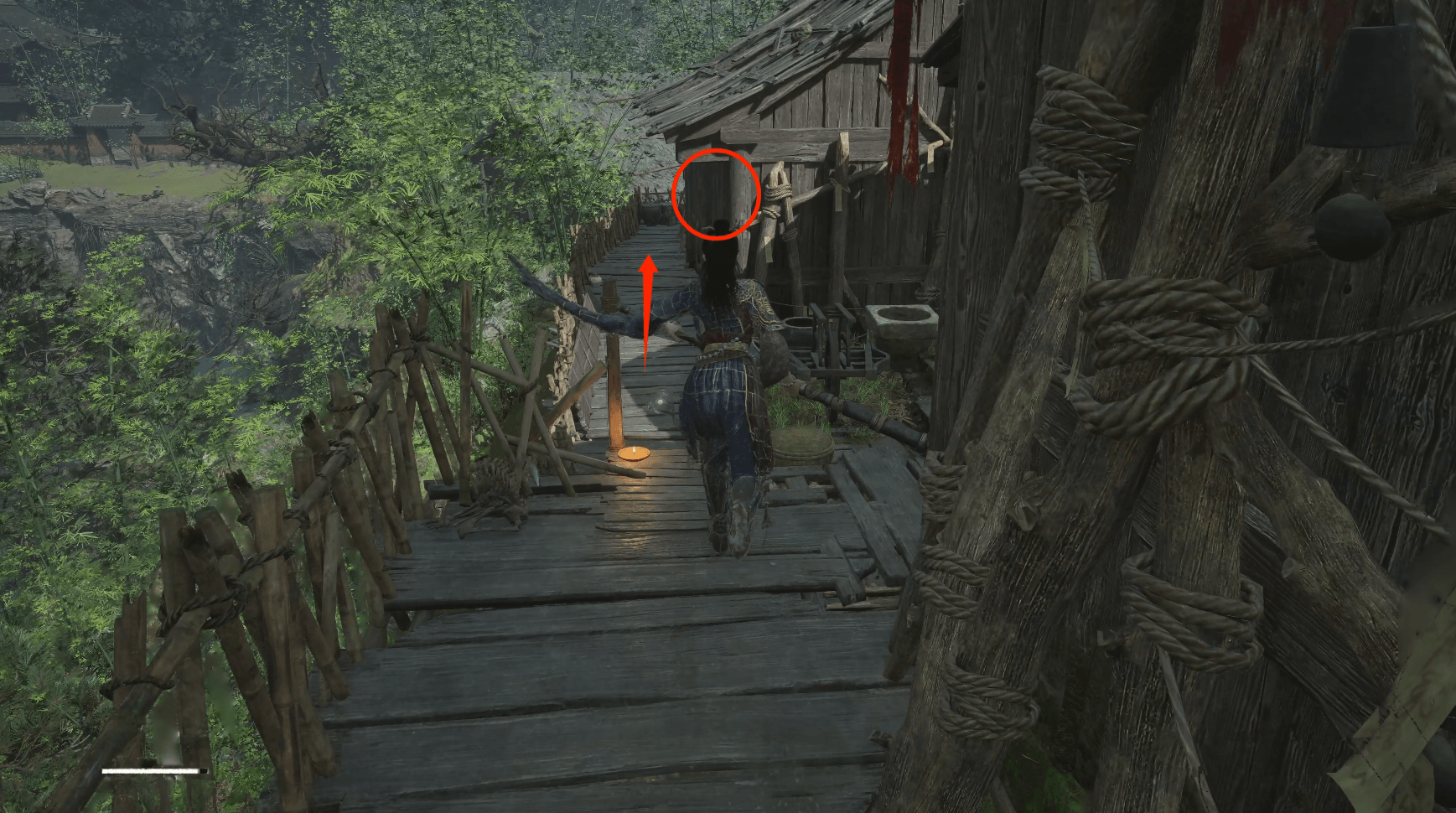 在阳台绕行时,可以发现一个已破碎的栅栏,旁边可以拾取【紫山茶*3】。此处的栅栏碎裂处以后将成为捷径。
