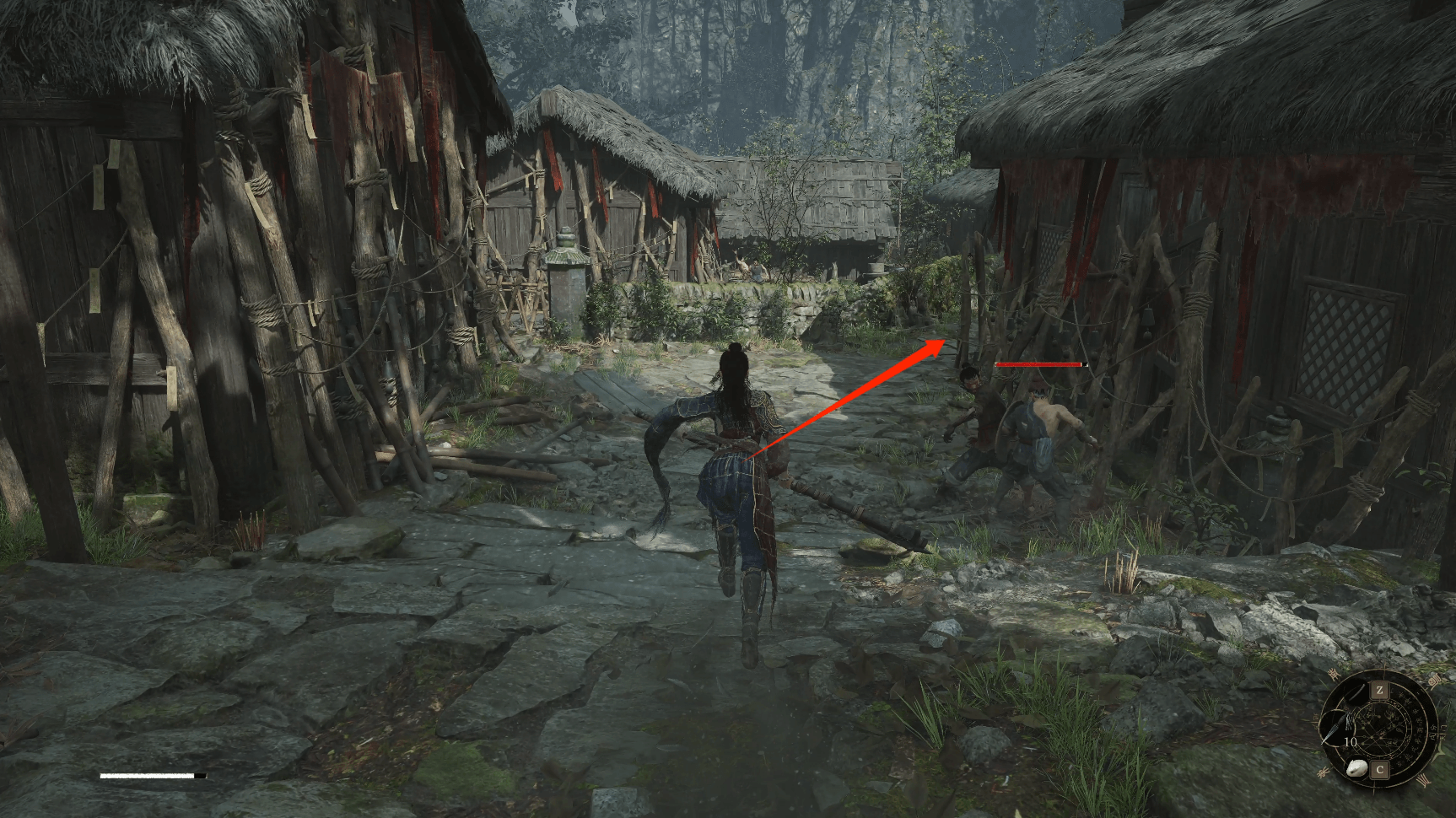 这里左侧箭头就是三步地我们第一次见到年岁长的地方,上一篇我们说这边这条路等解锁神龛再来的那边这样就连通上了,右侧几栋房屋我们上一篇已经探索完毕。