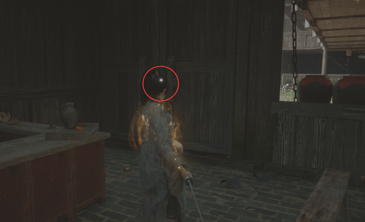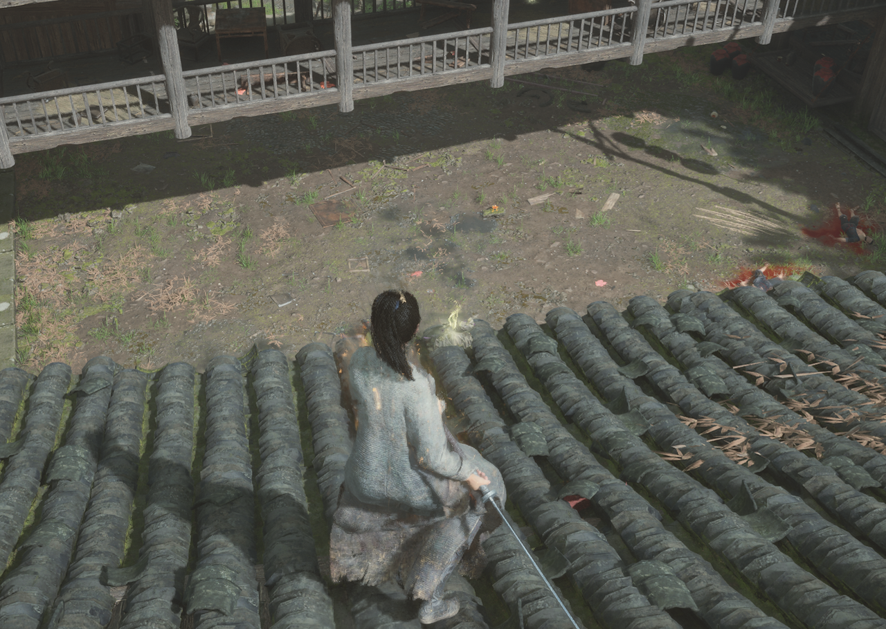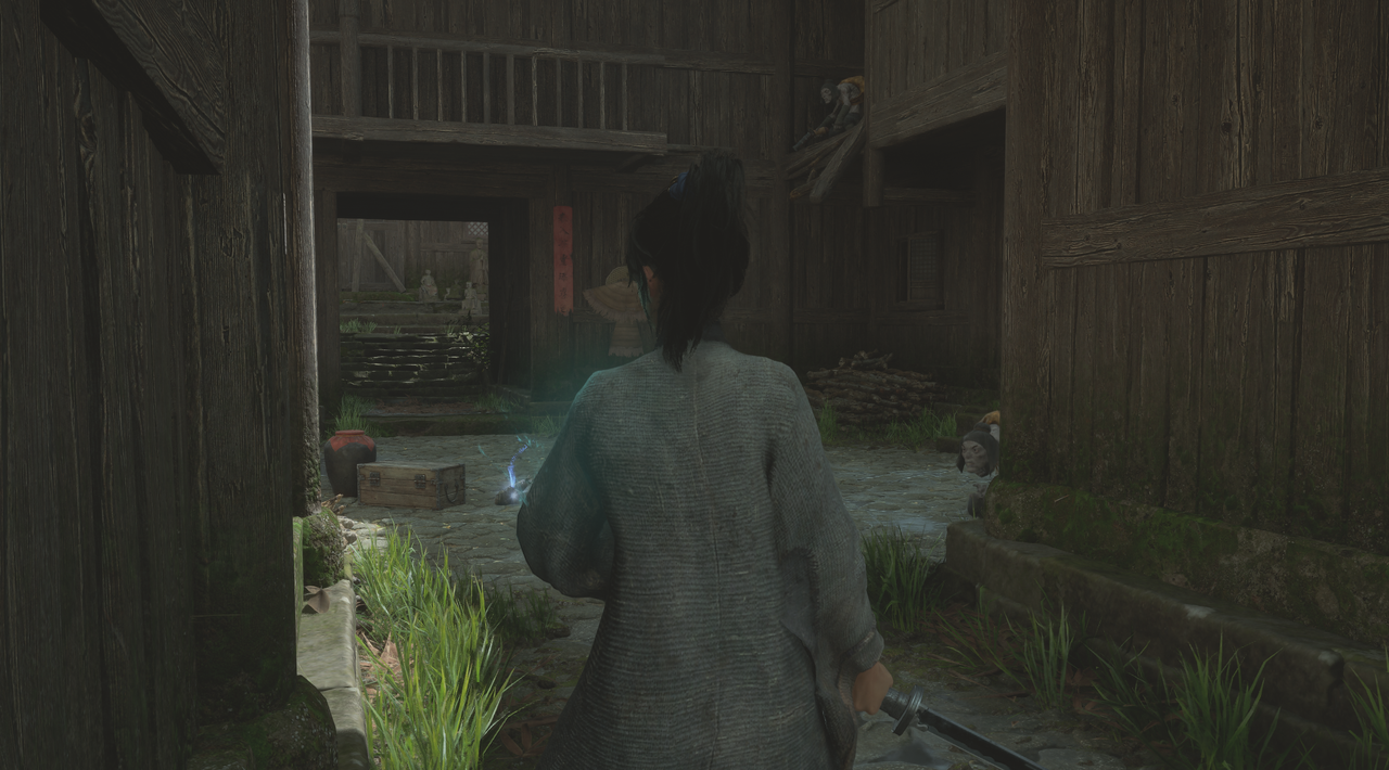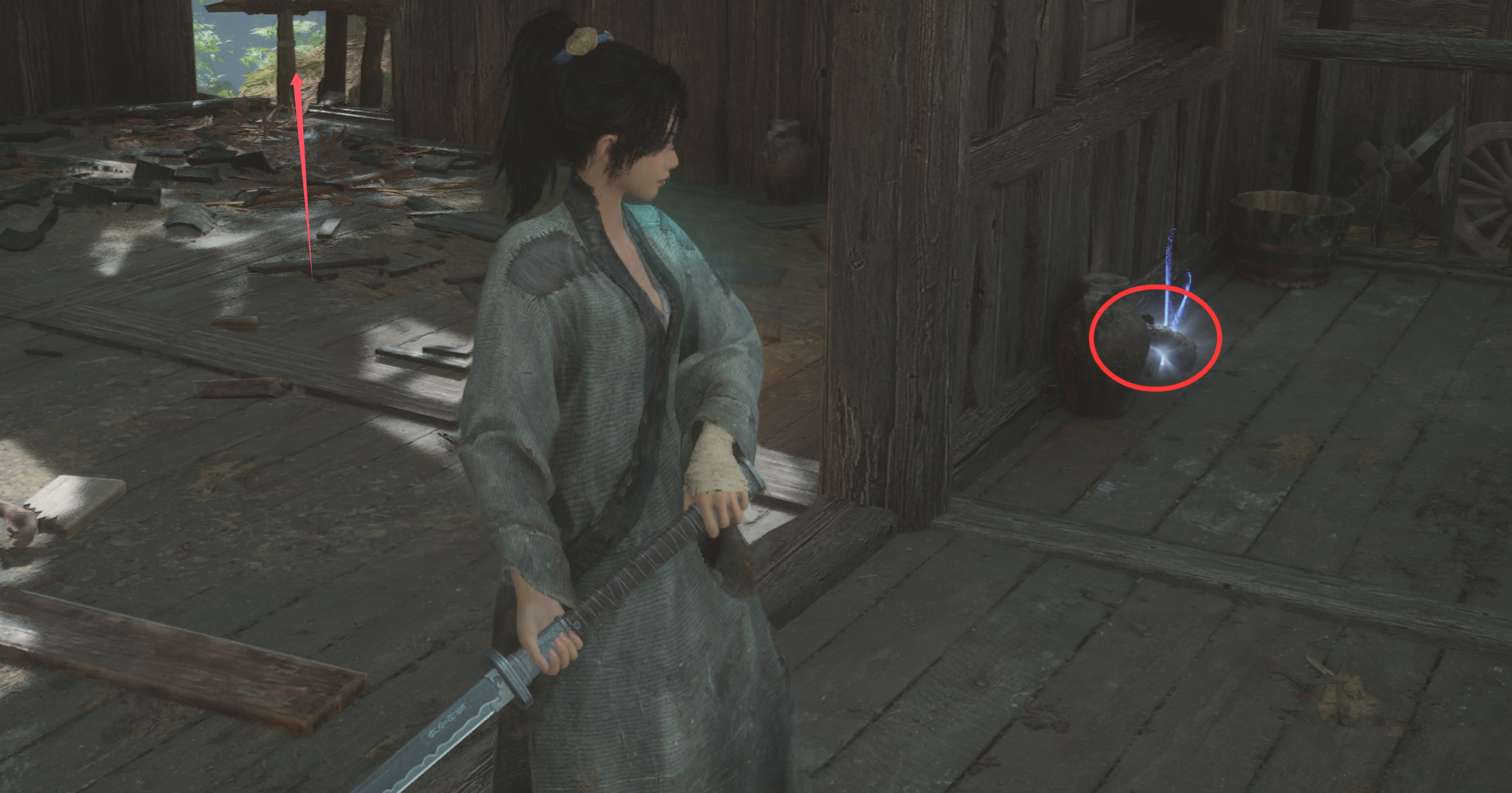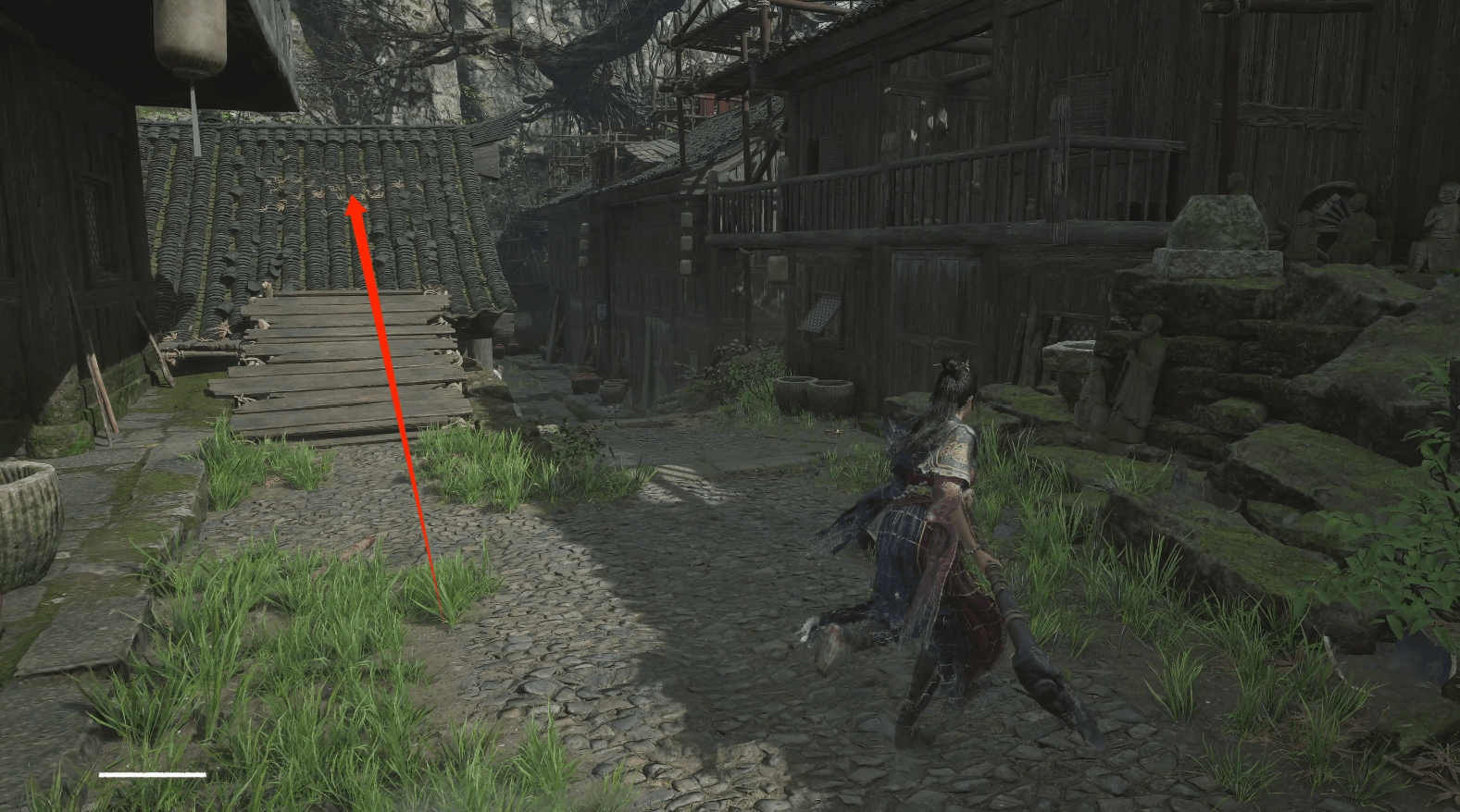 到屋顶沿箭头方向走,获得萌发的赤汞*1,注意不要被老和尚怼下楼去了,继续前进到最里面木梯下楼,击败两名闲聊的敌人后走侧面打开门,以后来这边就可以从这个路线绕后避免被伏击石头砸到。