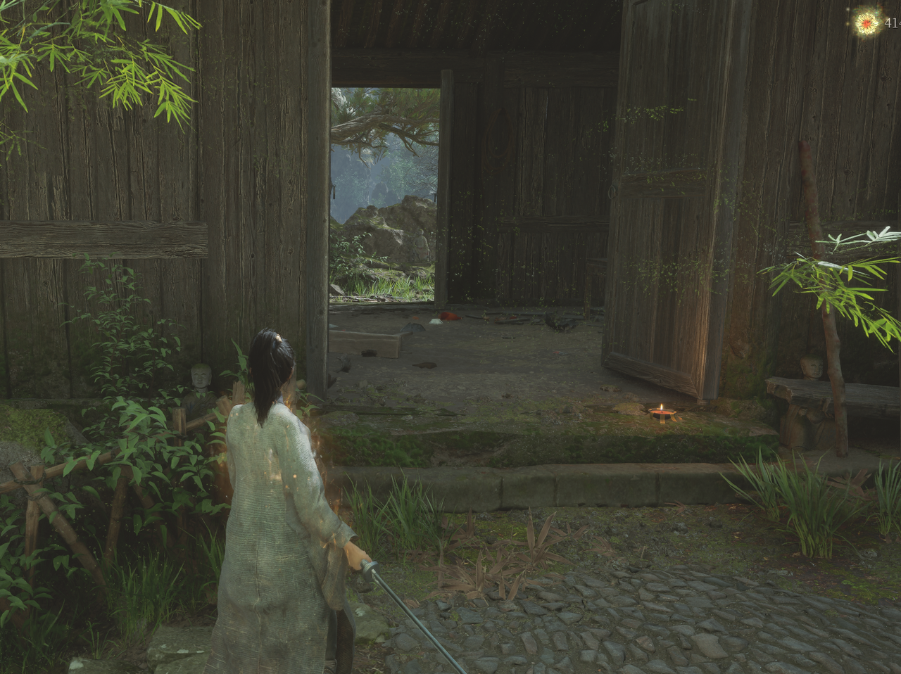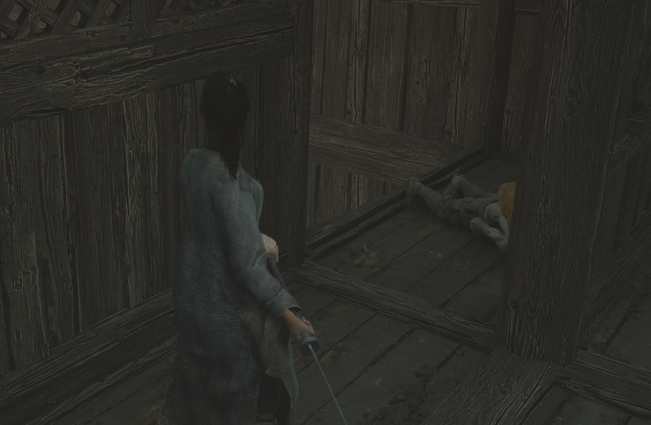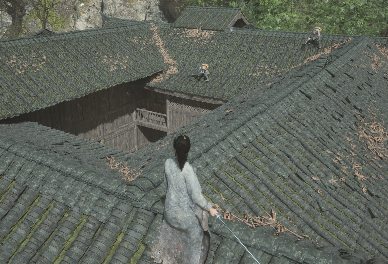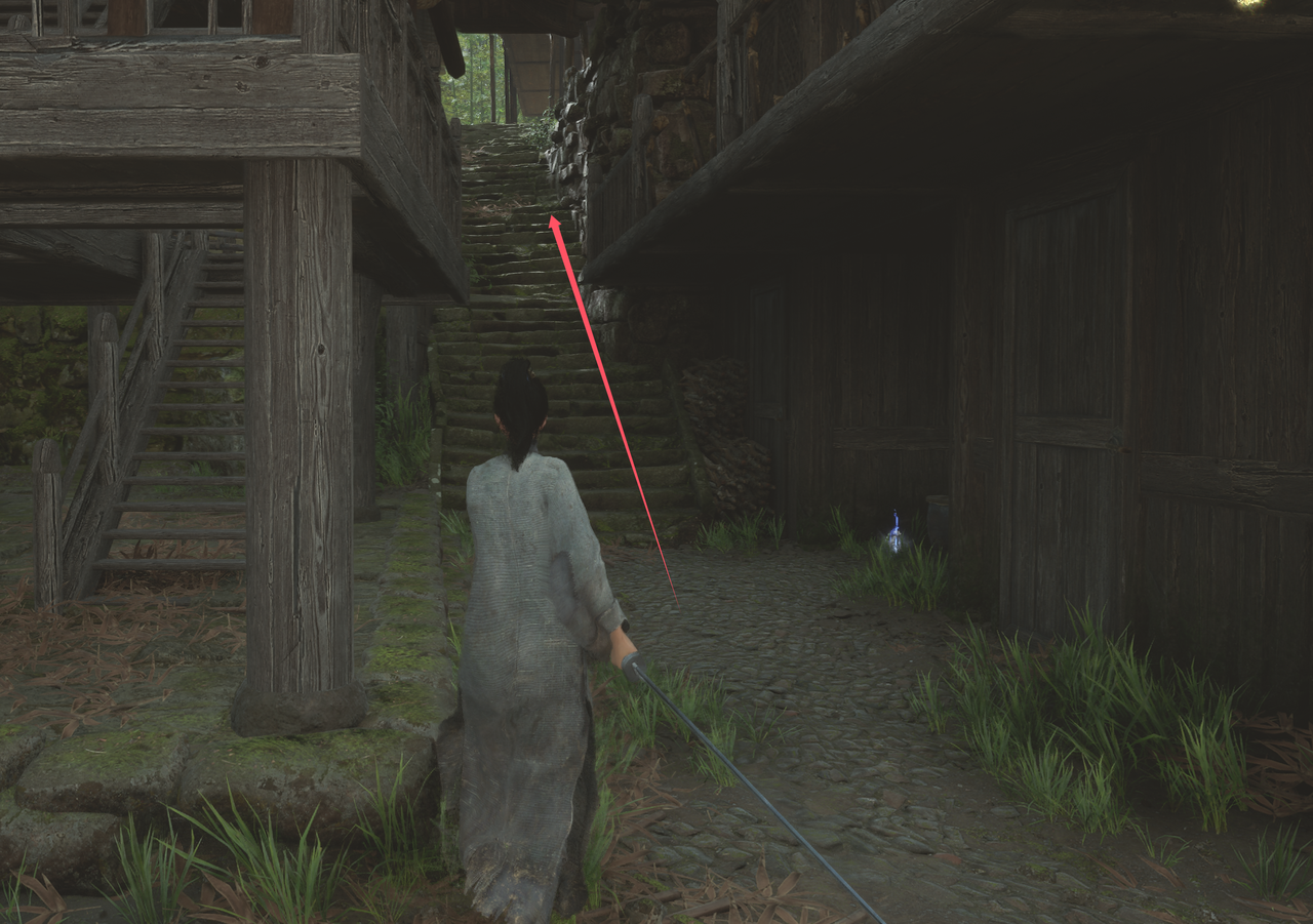 到屋顶沿箭头方向走,获得萌发的赤汞*1,注意不要被老和尚怼下楼去了,继续前进到最里面木梯下楼,击败两名闲聊的敌人后走侧面打开门,以后来这边就可以从这个路线绕后避免被伏击石头砸到。