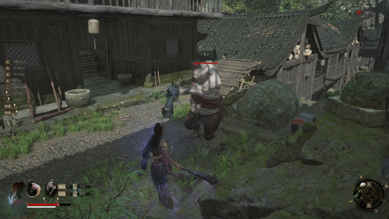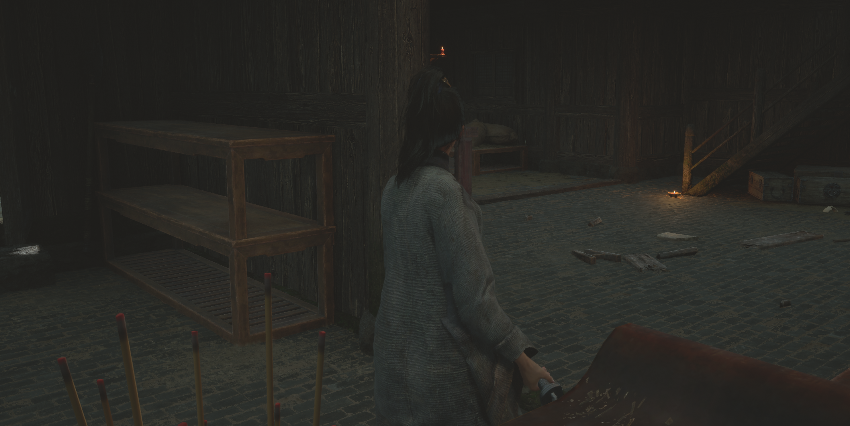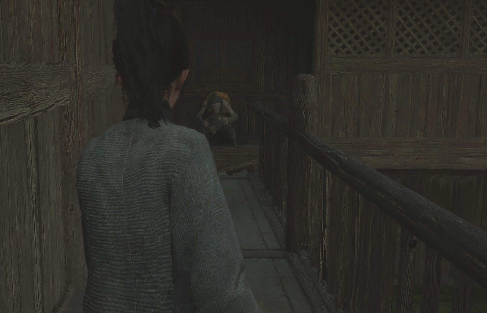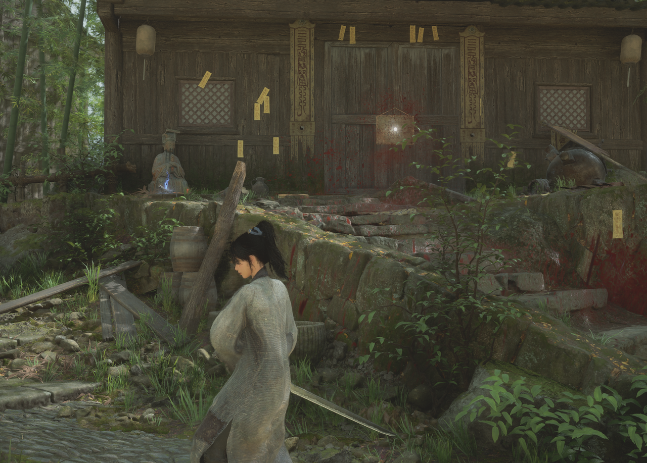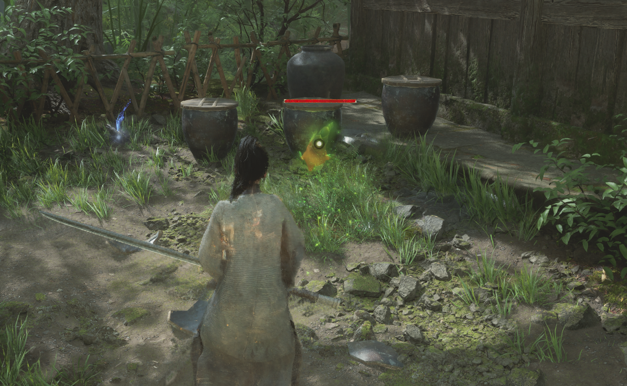 到屋顶沿箭头方向走,获得萌发的赤汞*1,注意不要被老和尚怼下楼去了,继续前进到最里面木梯下楼,击败两名闲聊的敌人后走侧面打开门,以后来这边就可以从这个路线绕后避免被伏击石头砸到。