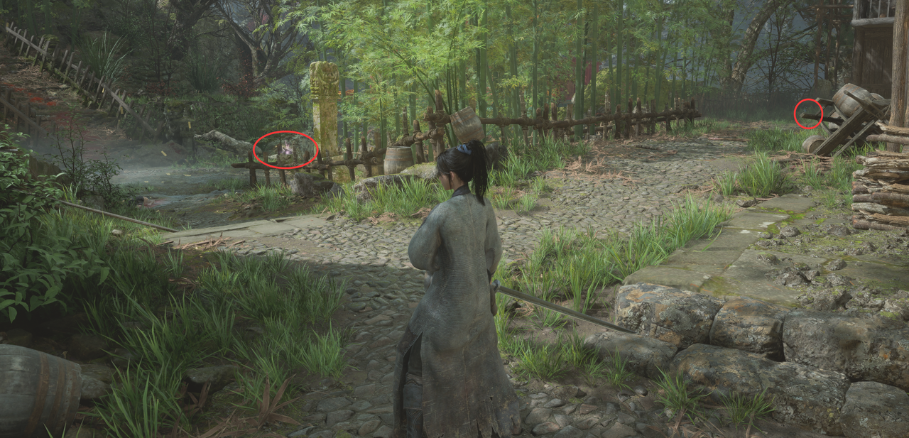左边可以捡到【紫山茶*2】,前方有棵没有叶子的干枯树干,踢倒它就会连通蜀王祠二楼,以后就可以更快从蜀王祠神龛上二楼来这边打BOSS或者探索丹青苑啦,树旁边有【灯芯草*2】