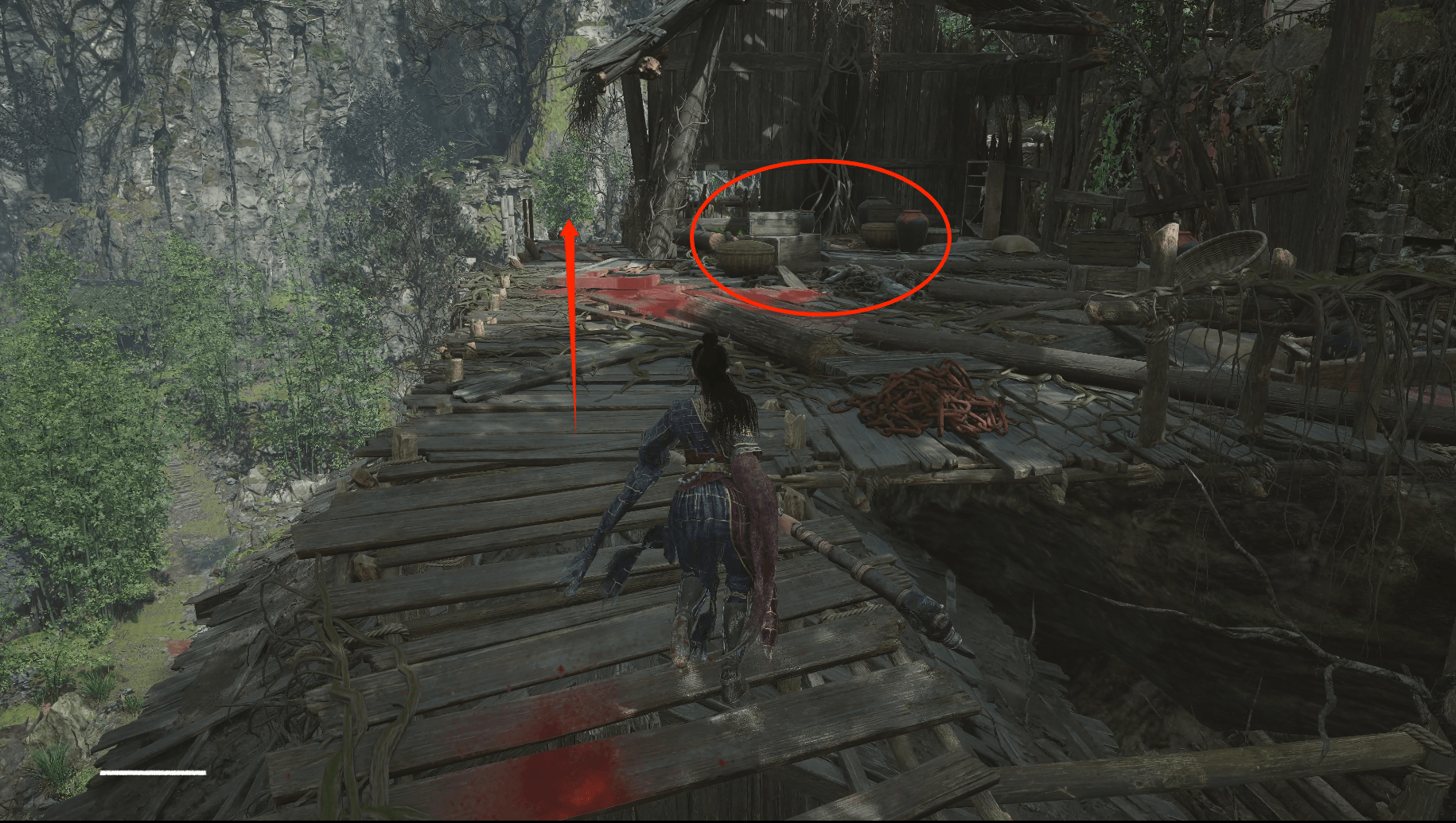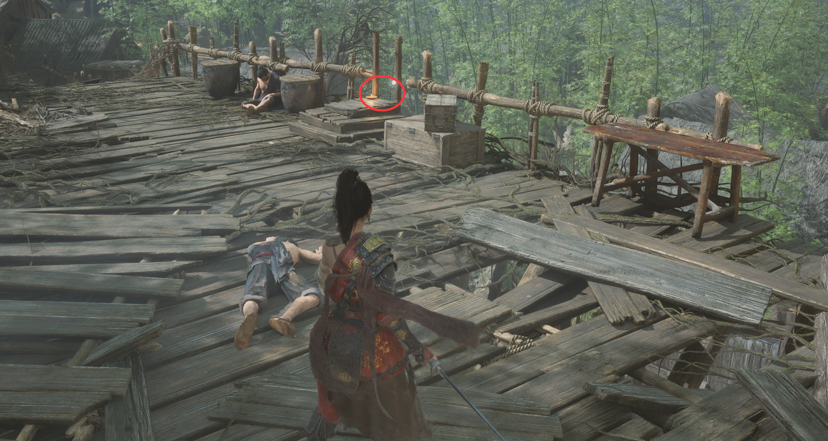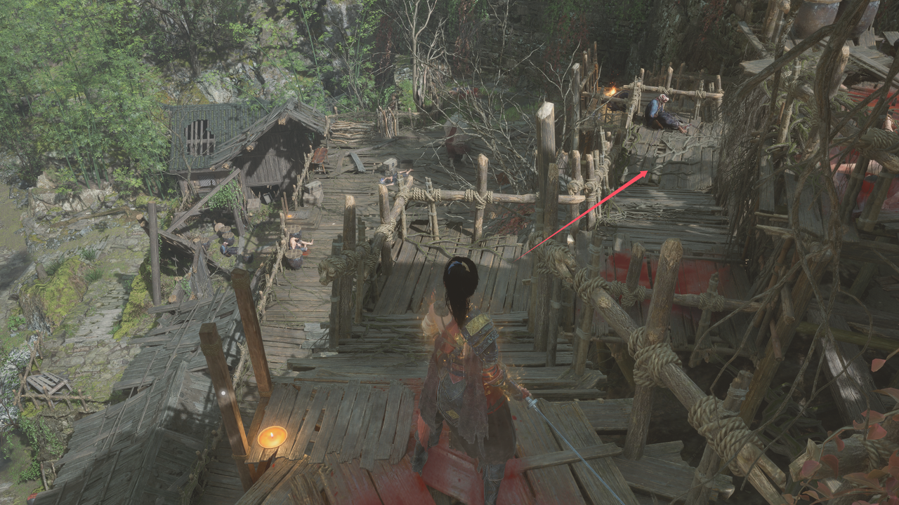隐形桥可以留着我们以后快速通过蜀王祠正门到侧山,但第一次为了全探索先不过桥,再朝蜀王祠方向往回走一点点,旁边有架梯子,沿梯子到屋顶,木桥也能通向对岸,桥上可以拾取【赤色灯笼果*1】。沿着桥往前直走对面屋顶上拾取【灯芯草*1】。