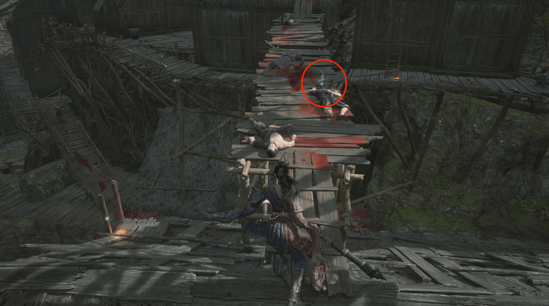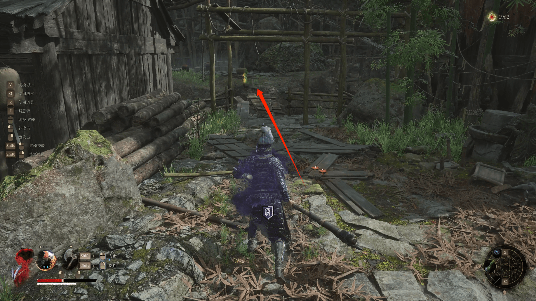 沿着路线向下走,这里右上方的捷径还未打通,顺着楼梯往下获得【灯笼果*1】,下方手持石板的敌人旁边拾取【萌发的赤汞*1】,右侧有向下的梯子,爬下去可以推门开一条近路,同时获取【火油弹*1】【赤汞幼芽*1】,竹篮后【生长的赤汞*1】。