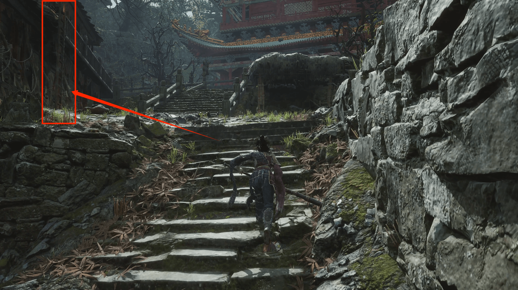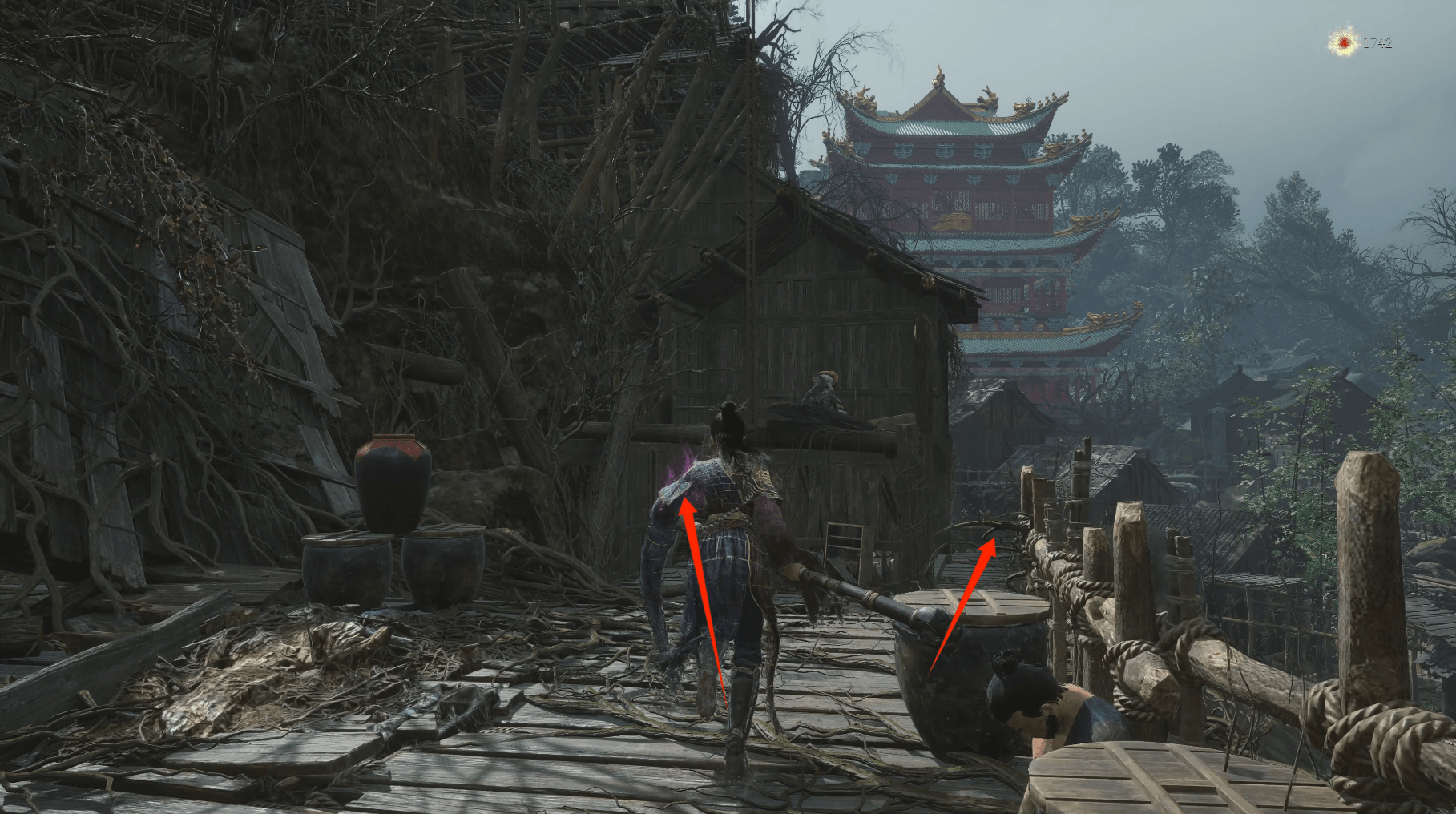 我们回到蜀王祠,从蜀王祠正门出去,击败红眼明军后,你会注意到右侧的断桥。这里的发光物体是隐形桥的提示,沿着桥边小心前进,接下来你会发现一些内容值得进一步探索