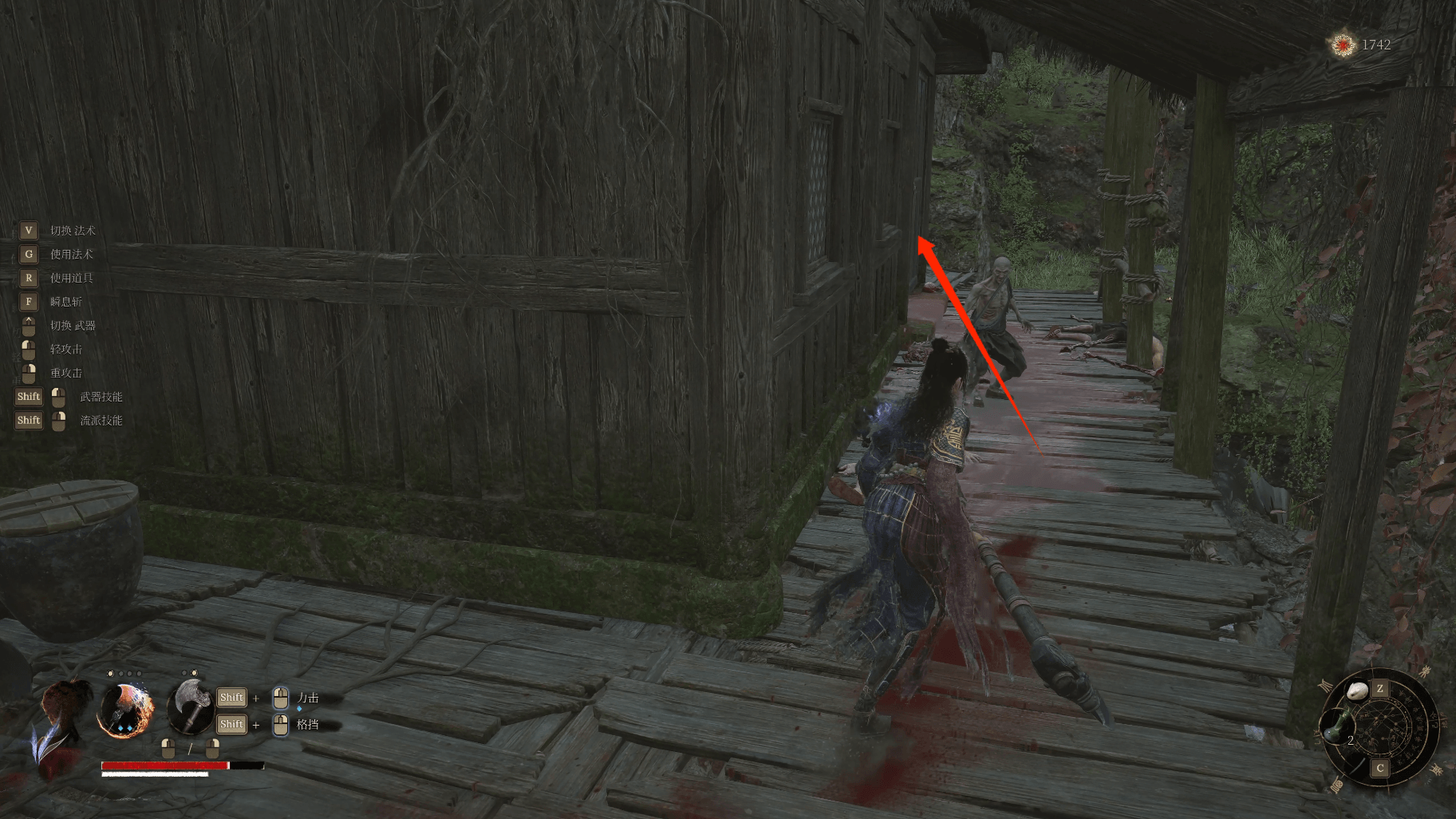 顺着梯子再爬回来,前方破败房屋左侧箭头上楼梯,击败小怪拾取【火油弹*3】,二楼旁边的梯子就是之前说先别爬的那架,以后可以直接从这里下来。再顺截图右侧箭头直走到底拾取【飞刀*3】,尽头的楼梯会回到我们最开始的屋顶楼下。