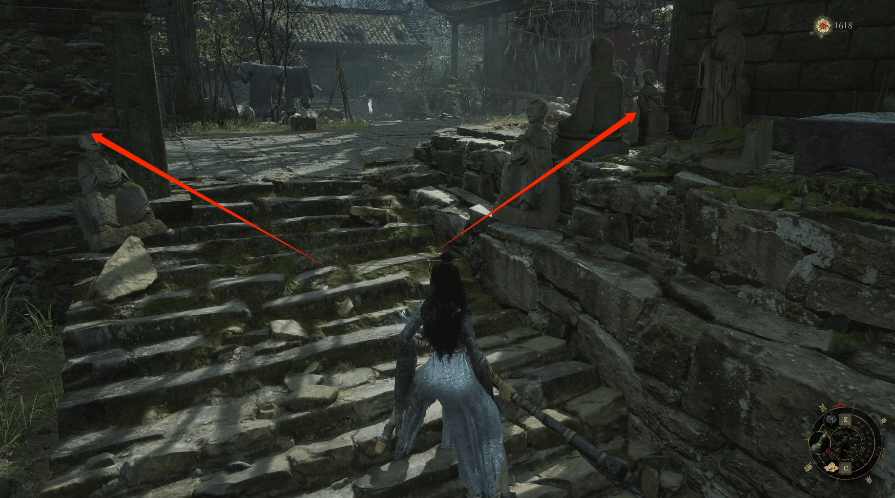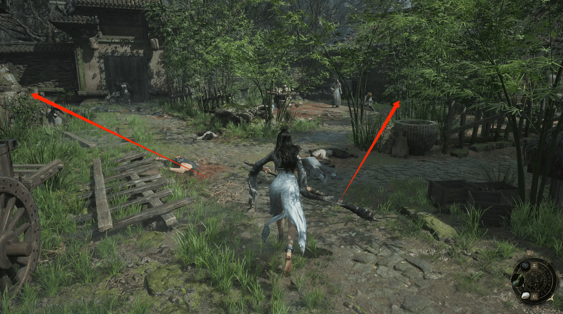 回到含光禅院的入口位置,沿左侧箭头处会看到两个房屋,分别可以拾取【新生的赤汞*1】和【顽猴玉佩*1】。不过要小心,这里的玉佩上方有两个敌人“老六”在巡逻。右侧箭头处,桌上可以找到【青霜·单手剑*1】,而屋内击败僧人后则可以获得【蒸面兔*3】。
