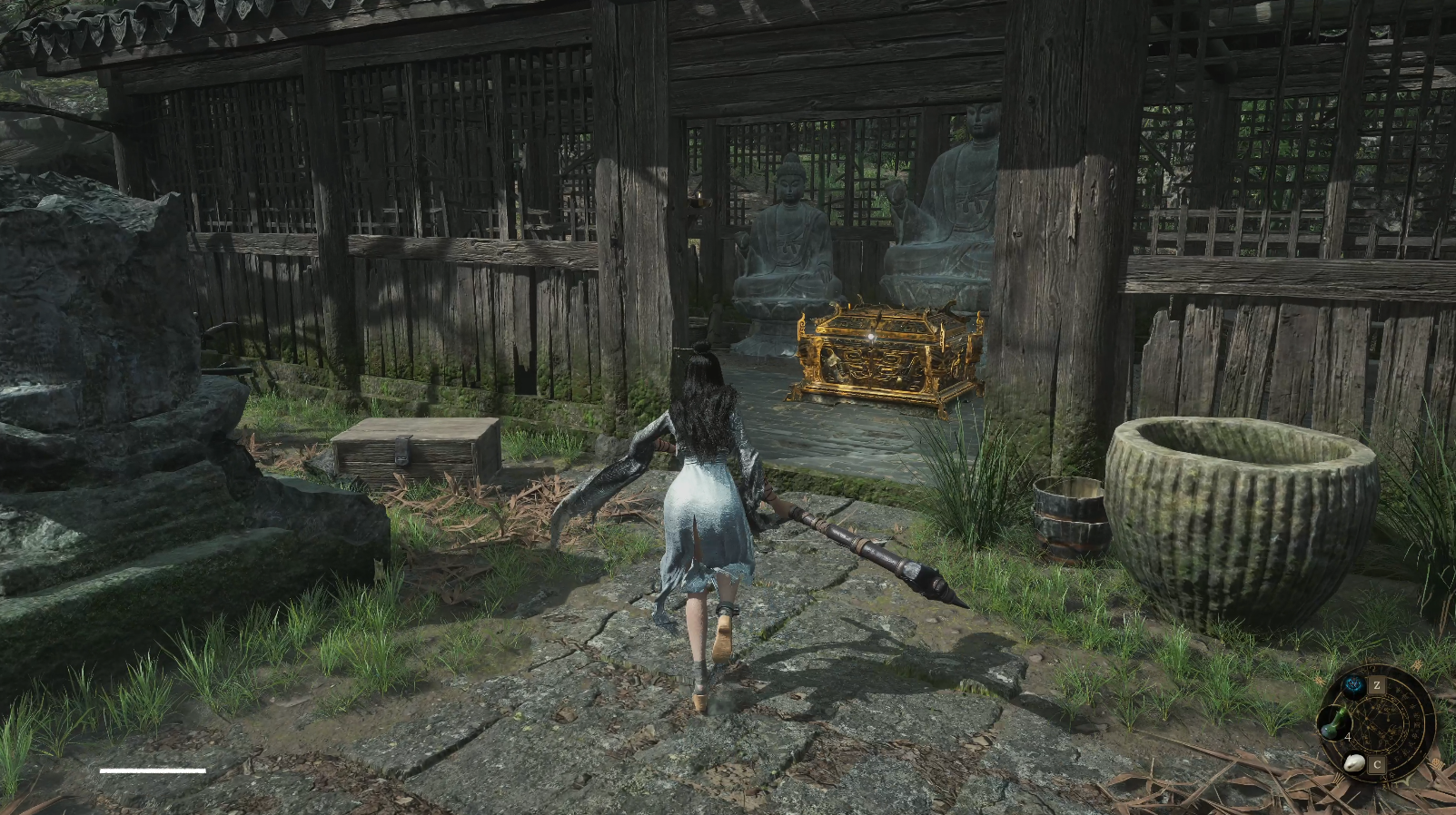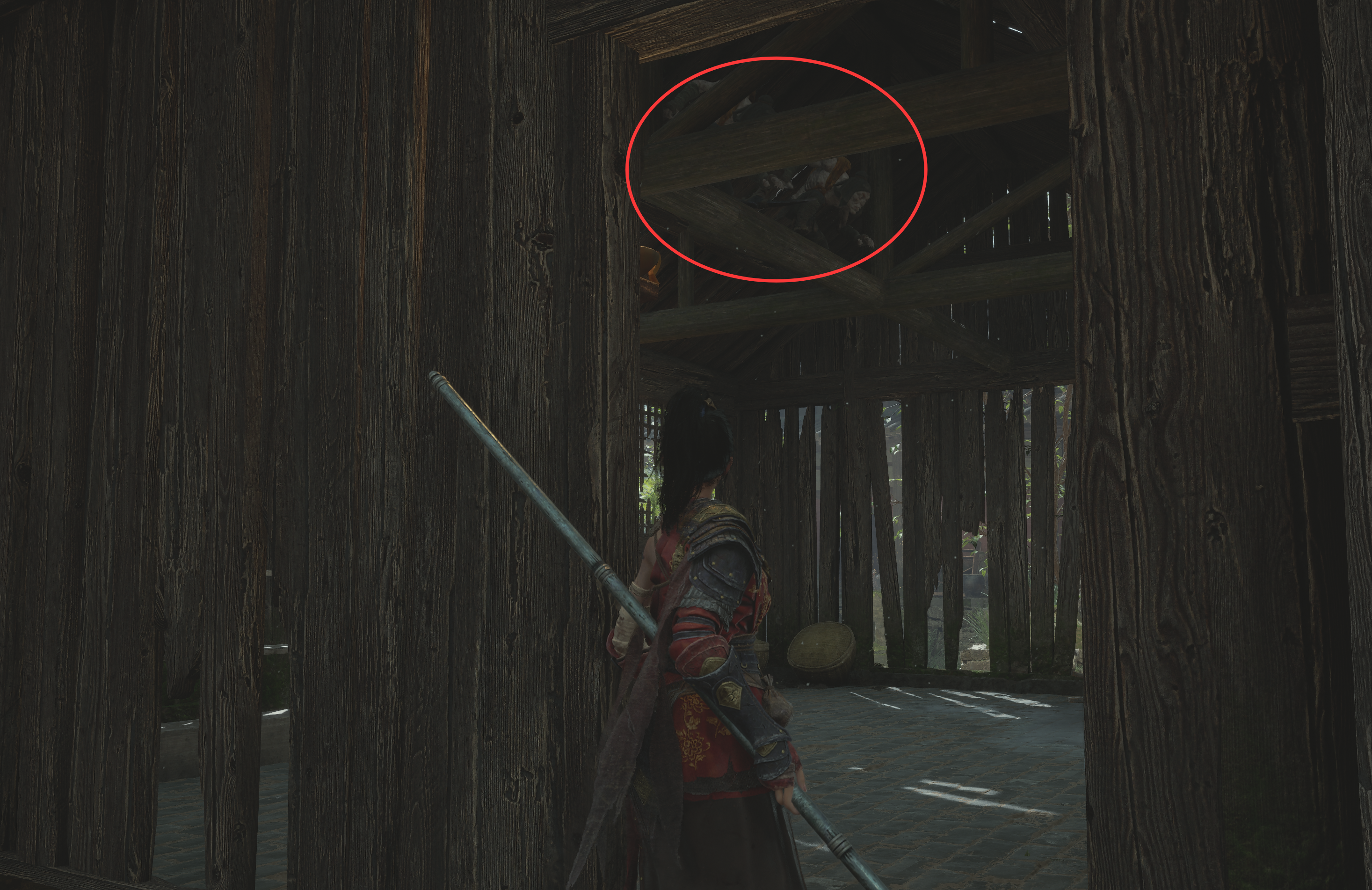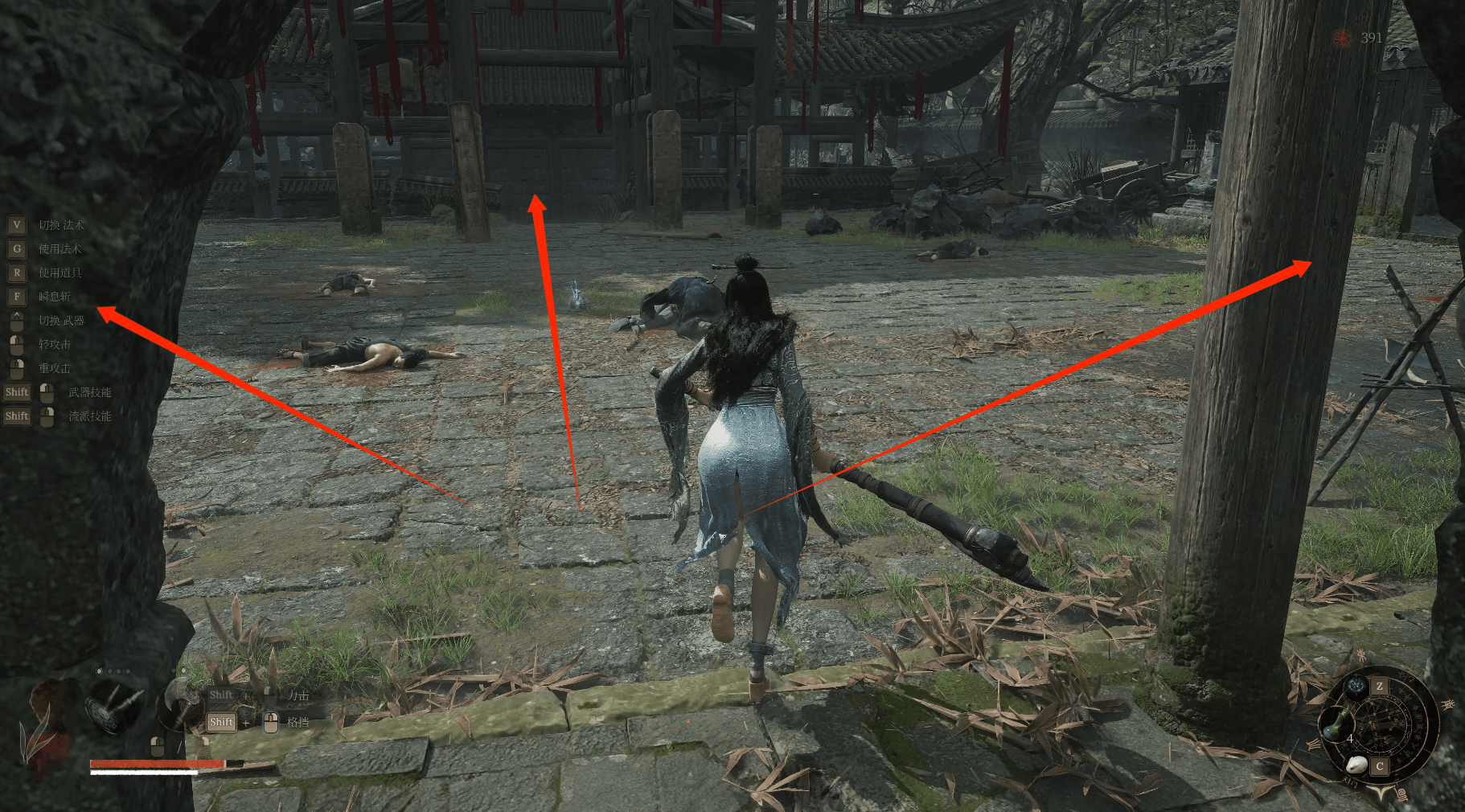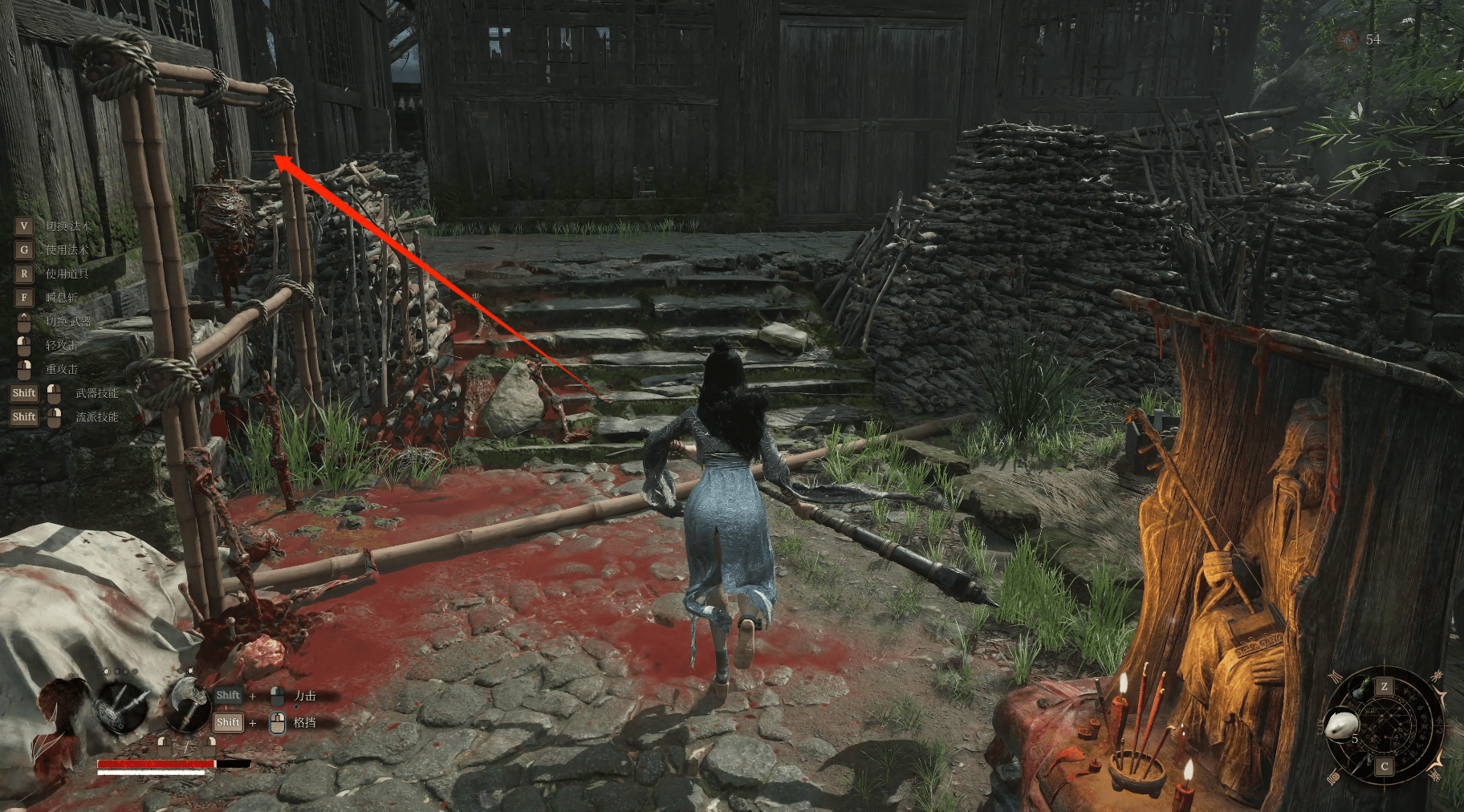 继续回到神龛旁,神龛对面有一个大院。先清理院内的敌人,再往左侧箭头的小路走。路的尽头会有一个坛子,打碎后你可以获得【小药丸*1】。接着回到大院的右侧,击败两名敌人后,可以在桌前找到【穆桂英面人*1】。这个面人物品虽然强力但是不建议使用,后续可以给NPC做任务。屋内还可以拾取到【黯淡红羽】。