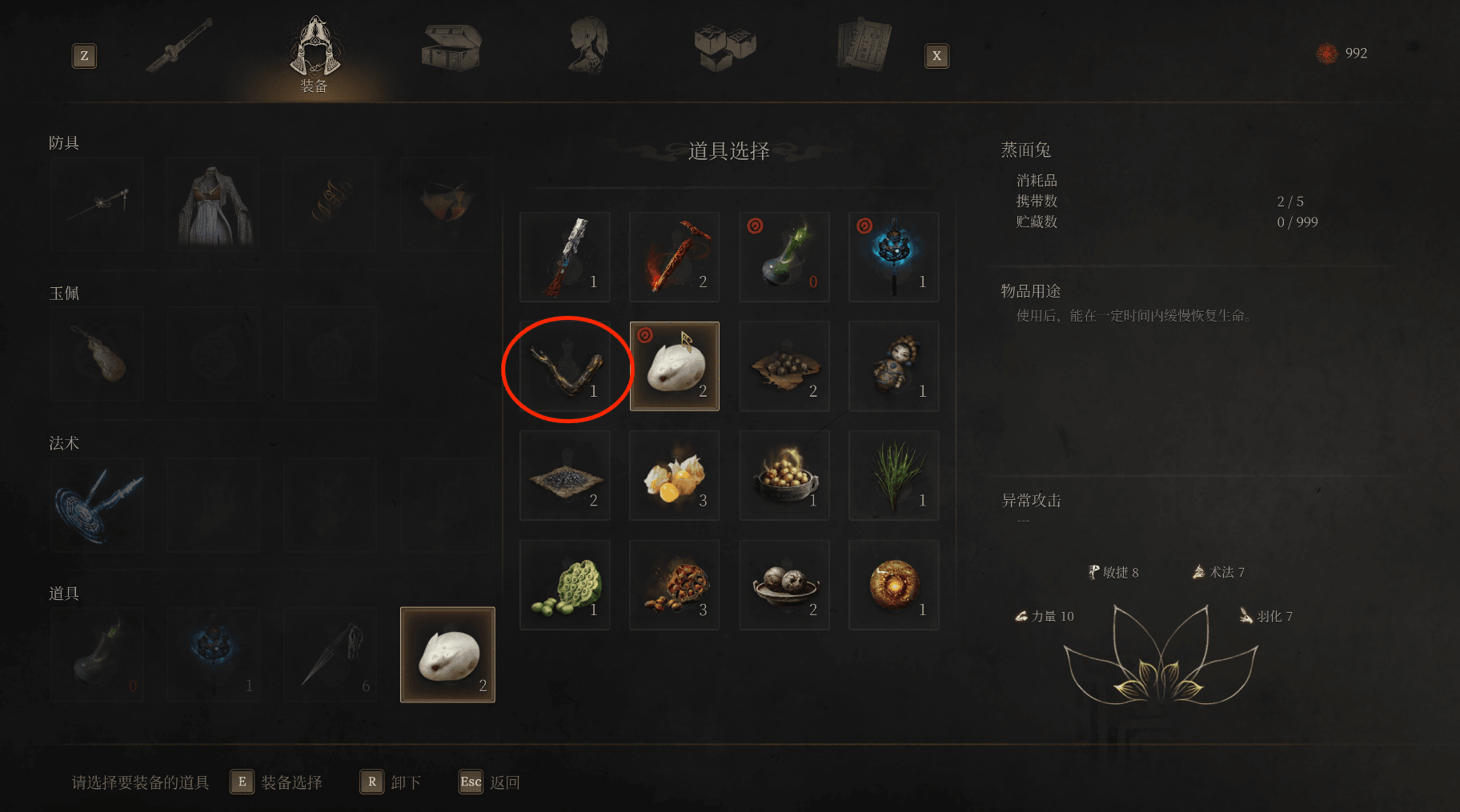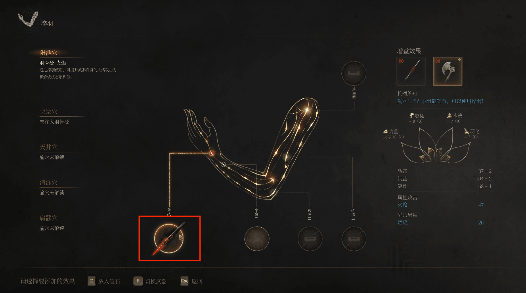 击败【盗墓贼首·吃人头陀】后会获得【铜尊】【羽骨砭·火焰*1】【淬羽经脉*1】【禅院钥匙】法术【头陀的回响】。解锁【淬羽】后我们可以在神龛界面选择调整,淬羽能为当前武器附着特殊异常效果。放入不同的【羽骨砭】和【砭石】来改变淬羽效果的类型。