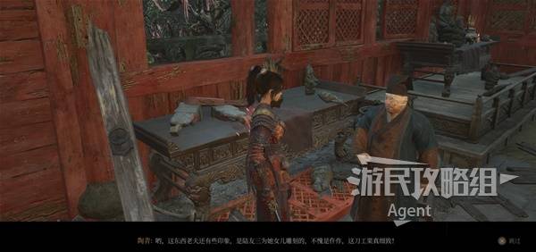 2、来到蜀王祠一楼,吴刚和女道士旁见到陶青,给他头陀的铜尊,商店解锁购买【防具】头陀套装。通过对话得知:头陀抢来戏班的冯小宛,被抓那俩小孩就是冯小宛的俩儿子。