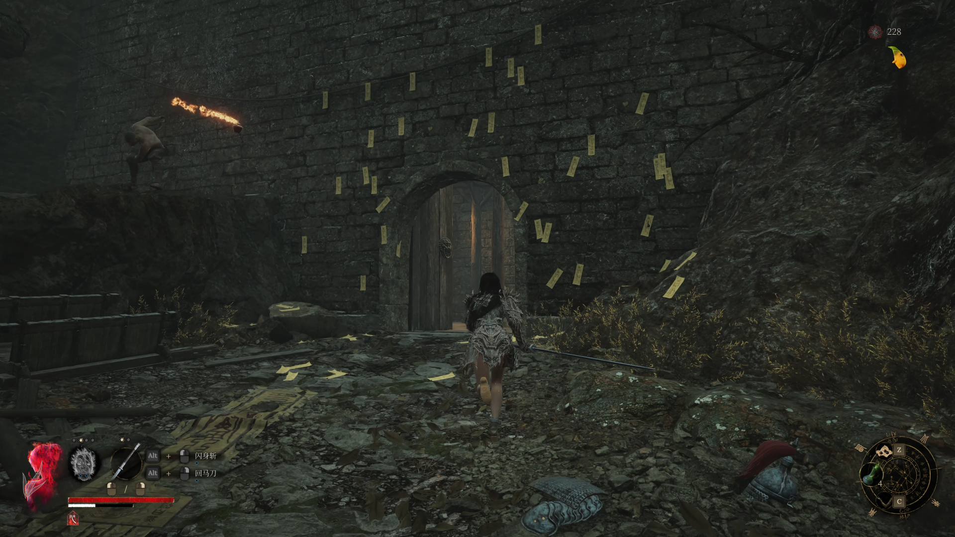 从神龛出来一路前行,很快就能看见远处高耸的灰白色城墙,那便是行宫关隘所在的位置。不过别急着冲过去,先留意路两侧的敌人埋伏。特别是靠近左侧区域时,需要警惕一个会不断丢掷火壶的小怪。这个敌人虽不强,但他的火壶命中后不仅会击退玩家,还会给你叠加燃烧状态,一段时间内持续掉血。如果不及时处理,很容易在后续战斗中陷入劣势。建议先用远程武器将其击杀,或者绕后偷袭快速解决。总之,不要大意