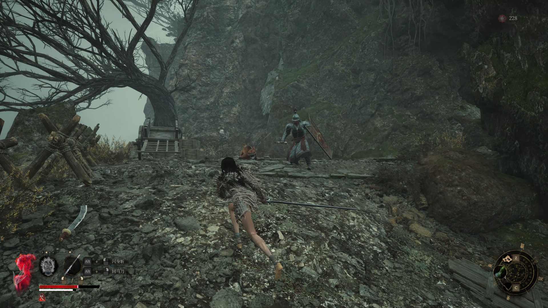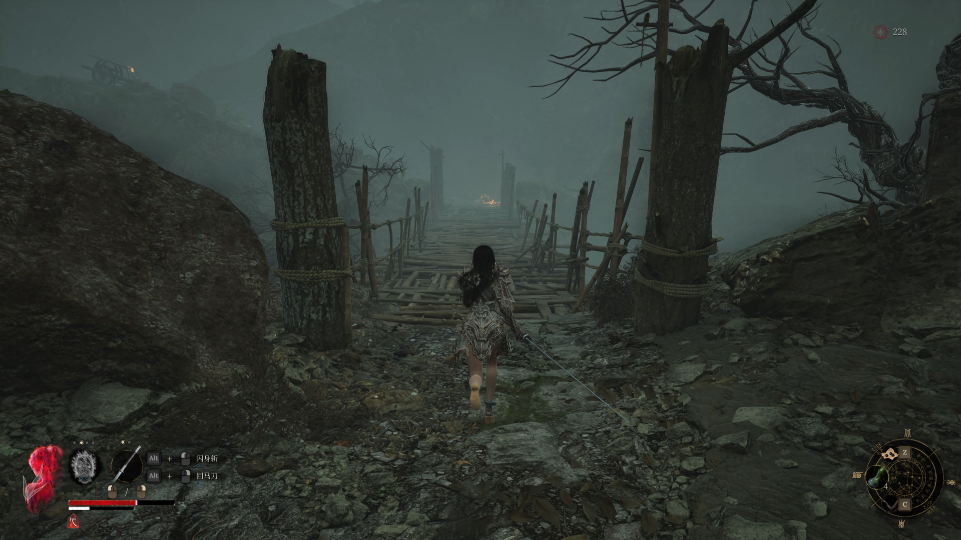 走上台阶后是一段木桥,过桥后就进入了敌人防守较密集的区域。桥后敌人数量明显增多,沿途分布着数个小兵和一名火枪怪。火枪怪虽然血量和防御不高,但射击频率很快,伤害高,且容易打断你的动作,因此建议优先解决